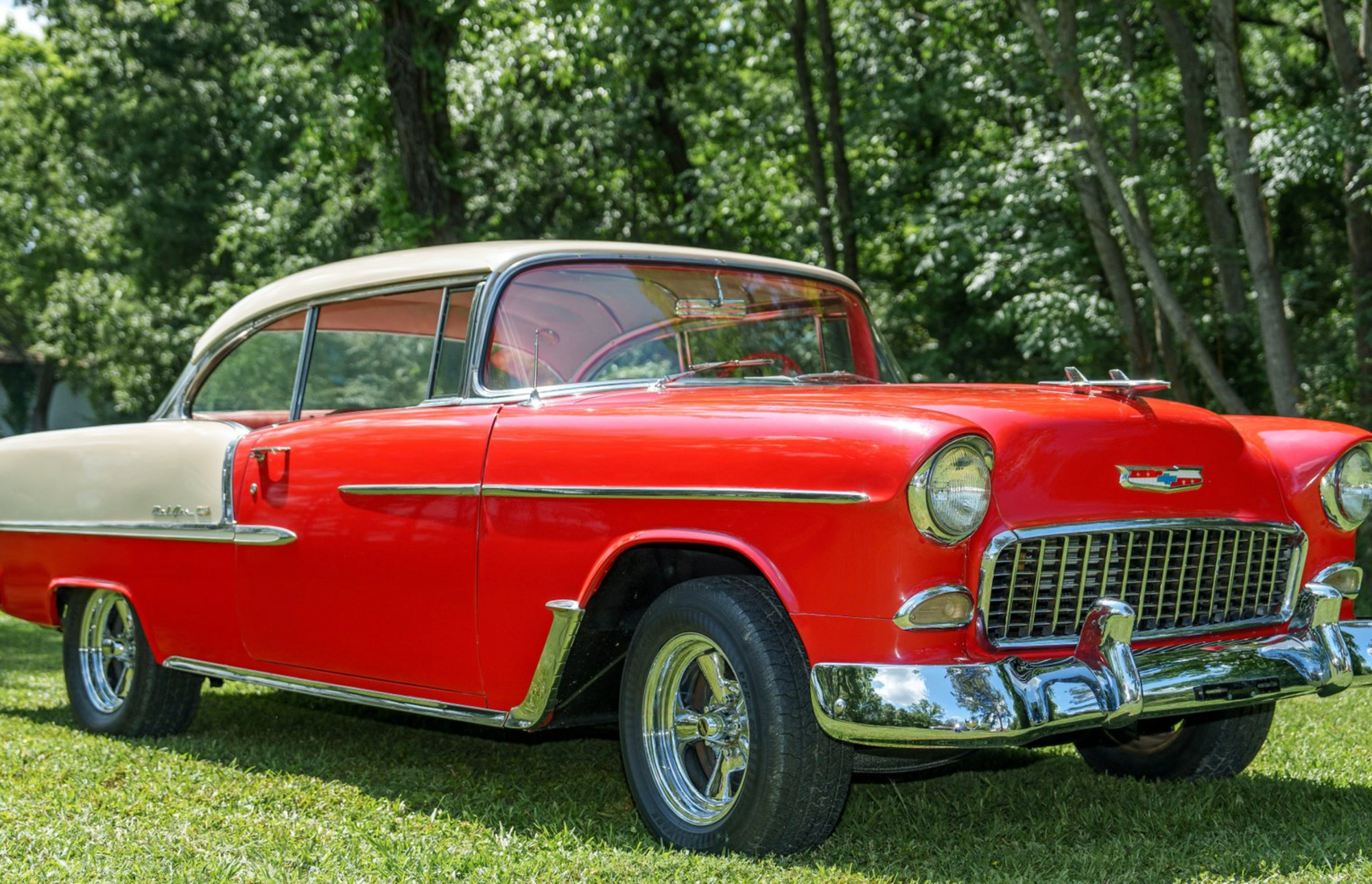 A beautifully restored 1955 Chevrolet Bel Air, featuring a two-tone Gypsy Red and India Ivory finish.