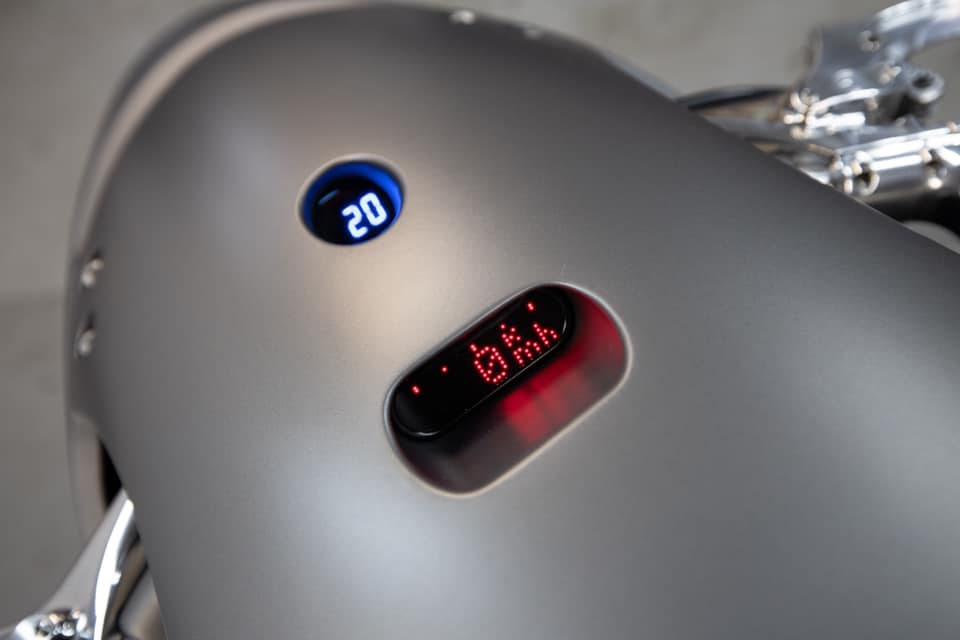 As for the cutting-edge tech, it starts with a HID lamp up front. Those BMW badges light up, too. All the gauges are digital yet don’t match each other in their design, adding to the eclectic nature of this ride. Slide the tail out and you’ll expose a secret compartment with the onboard electronics.
