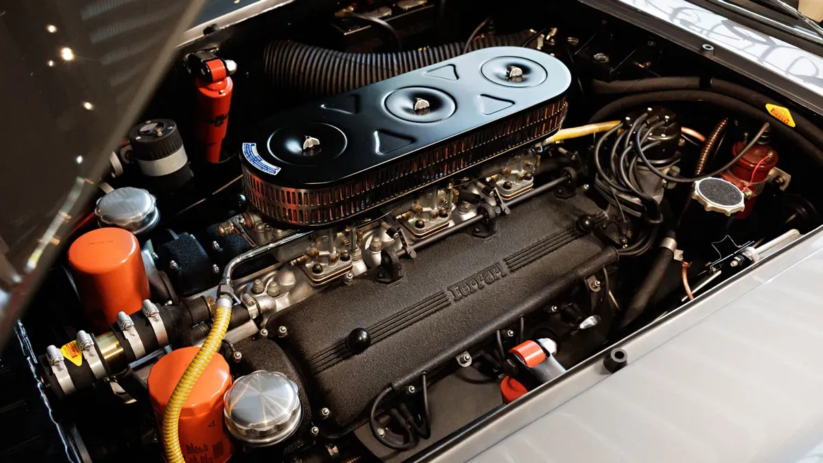 Under the hood, the Lusso is powered by Ferrari’s 3.0-liter Colombo-designed Tipo 168U V-12 engine, producing 236 horsepower at 7,500 rpm. Equipped with three Weber 36 DCS carburetors, the grand tourer was capable of reaching 150 mph—impressive performance for its era. A four-speed manual transmission, four-wheel Dunlop disc brakes and coil-over suspension at all four corners reflected cutting-edge engineering for the early 1960s.