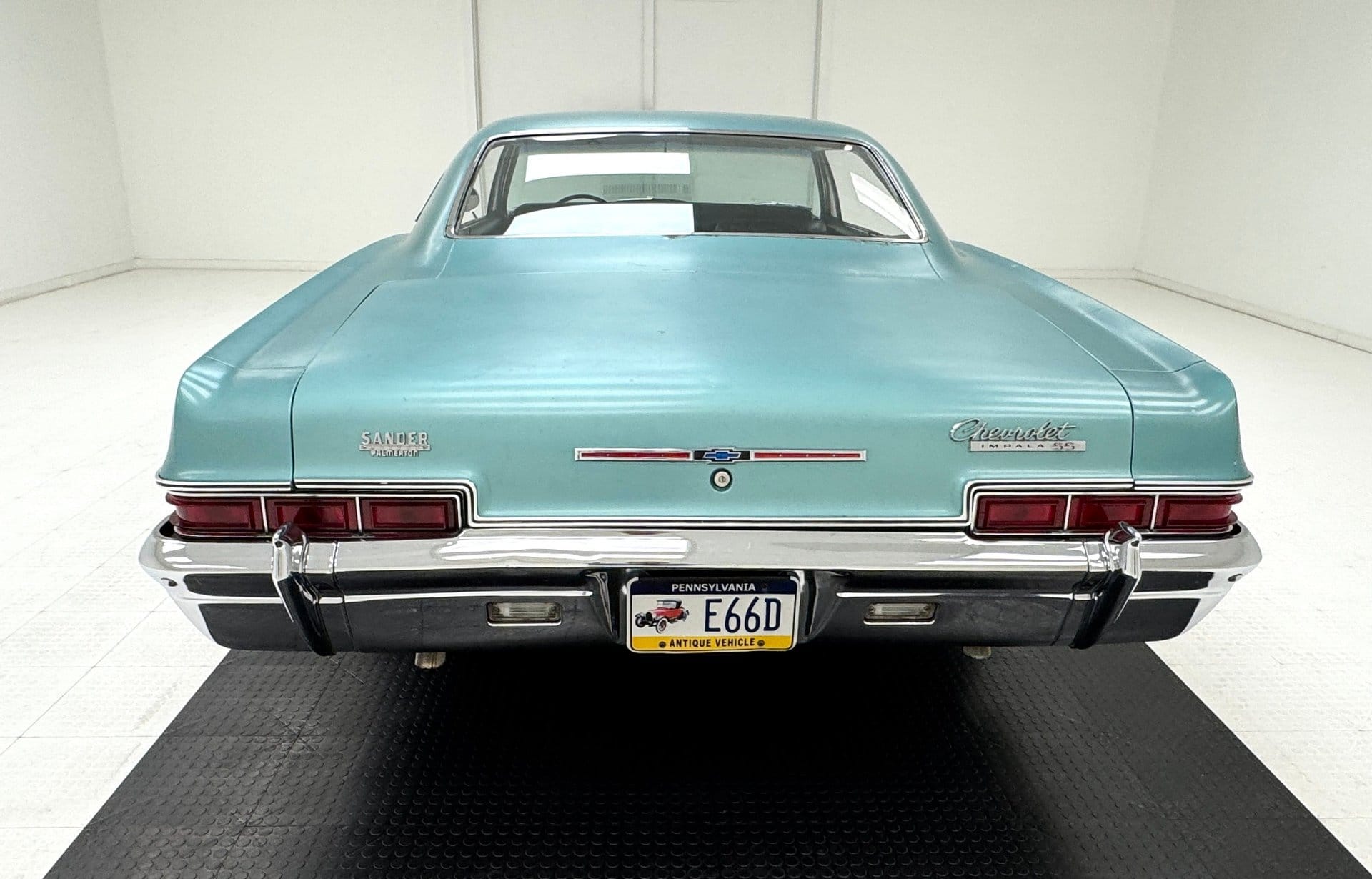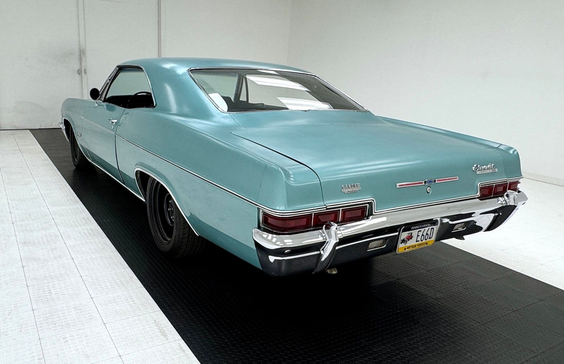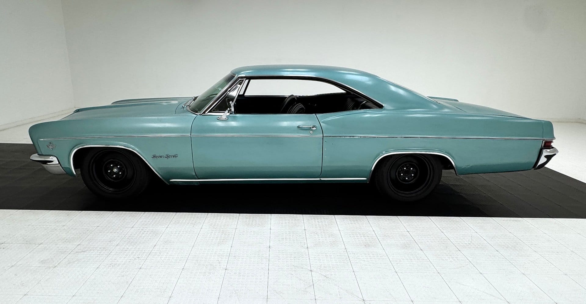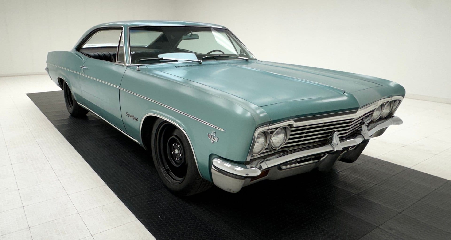 The Impala SS reflects Chevrolet’s mid-1960s design evolution, a period that moved away from prominent tail fins toward more sculpted bodywork and a lower, sleeker profile. Finished in its original Artesian Turquoise, the exterior retains a survivor-quality appearance with visible patina and signs of age, including paint chips, minor rust, and previous repair work. Black 17-inch wheels and chrome trim complement the car’s long, 213-inch body, while the original dealer badge remains intact.