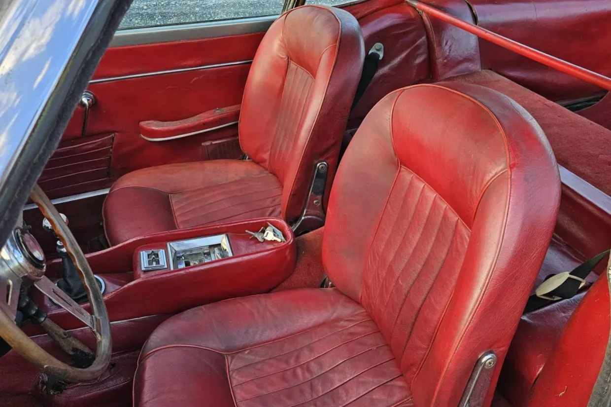 Inside, the cabin retains red leather bucket seats, matching trim, red carpeting, and a black dash. Equipment includes power windows and air conditioning, though the radio, sun visors, spare wheel, and spare well cover are absent. Instrumentation includes a Smiths speedometer and tachometer along with auxiliary gauges, showing 39,000 miles, though total mileage is unknown.