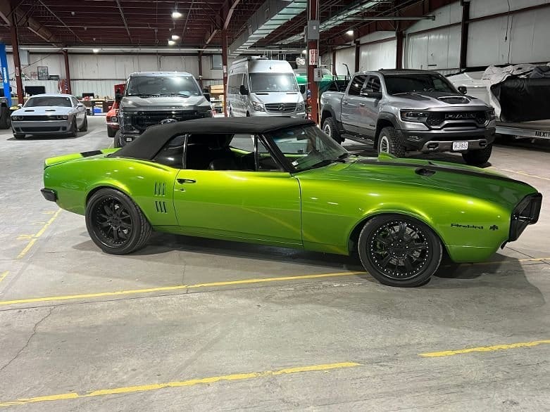 Visually, the car stands out with a striking Dodge Viper Snake Skin Green paint finish. The bold color was chosen to highlight the Firebird’s sculpted body lines while emphasizing the car’s role as a high-impact show vehicle. Black rims provide a sharp contrast to the vibrant green exterior, creating a modern aesthetic that complements the car’s classic design.