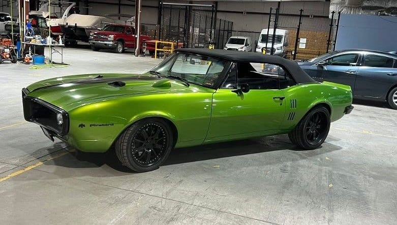 Inside, the convertible features a black interior that maintains a clean and understated look, allowing the exterior color and custom engineering to remain the focal points. The two-door layout preserves the traditional Firebird convertible styling while showcasing the extensive customization completed for the show build.