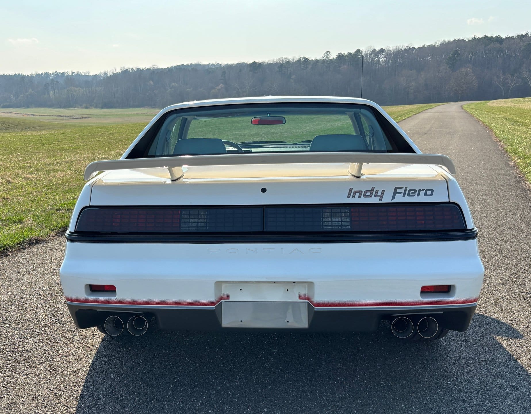 The Fiero Indy Edition stands apart visually with a combination of white and gray exterior finishes, complemented by model-specific graphics and badging. Design elements include a rear spoiler, pop-up headlamps, and gray lower body cladding. A left-side quarter panel air intake adds to the car’s unique appearance, while quad exhaust outlets further distinguish the rear profile. The package also includes 14-inch alloy wheels finished in white with a red outer stripe, reinforcing the special-edition identity.