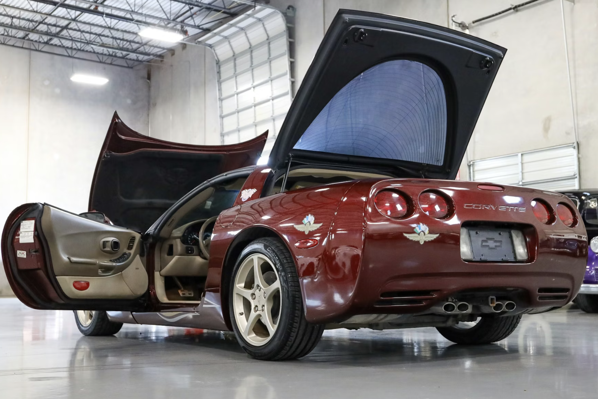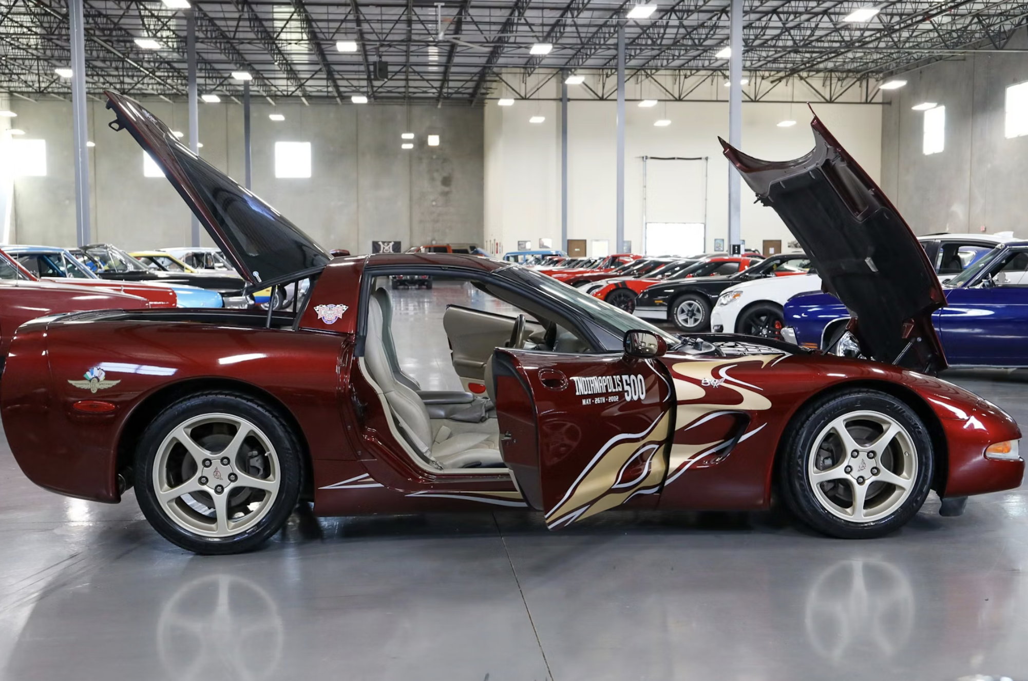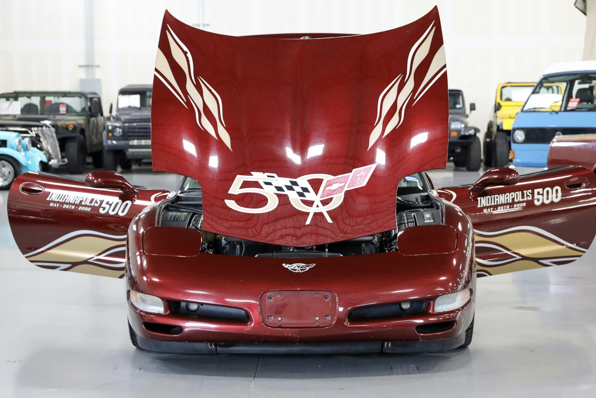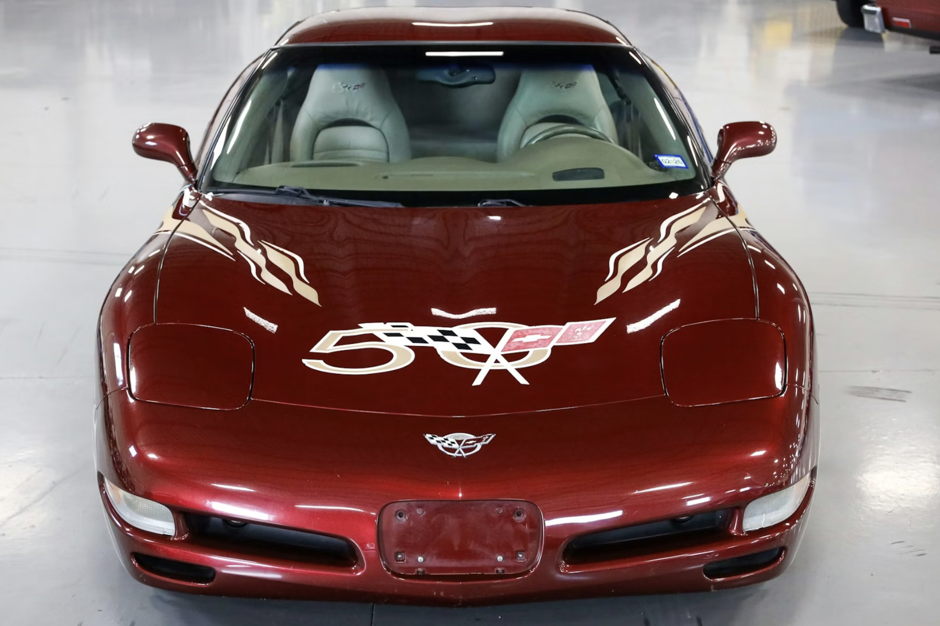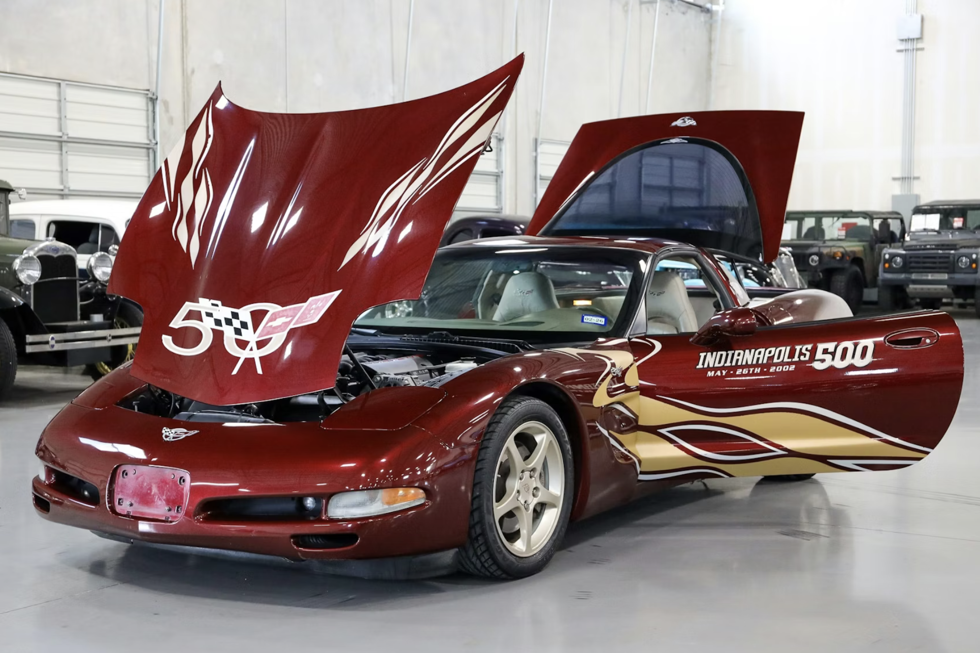 This particular coupe is one of only 4,085 examples equipped with the 50th Anniversary Edition package. It is finished in Anniversary Red with Shale leather upholstery and embroidered headrests. Special crossed-flags badging, 50th Anniversary floor mats, and color-coordinated aluminum wheels distinguish the commemorative model. The car retains its optional 2002 Indianapolis 500 pace car graphics, marking Corvette’s return as Indy 500 pace car for the first time since 1978.