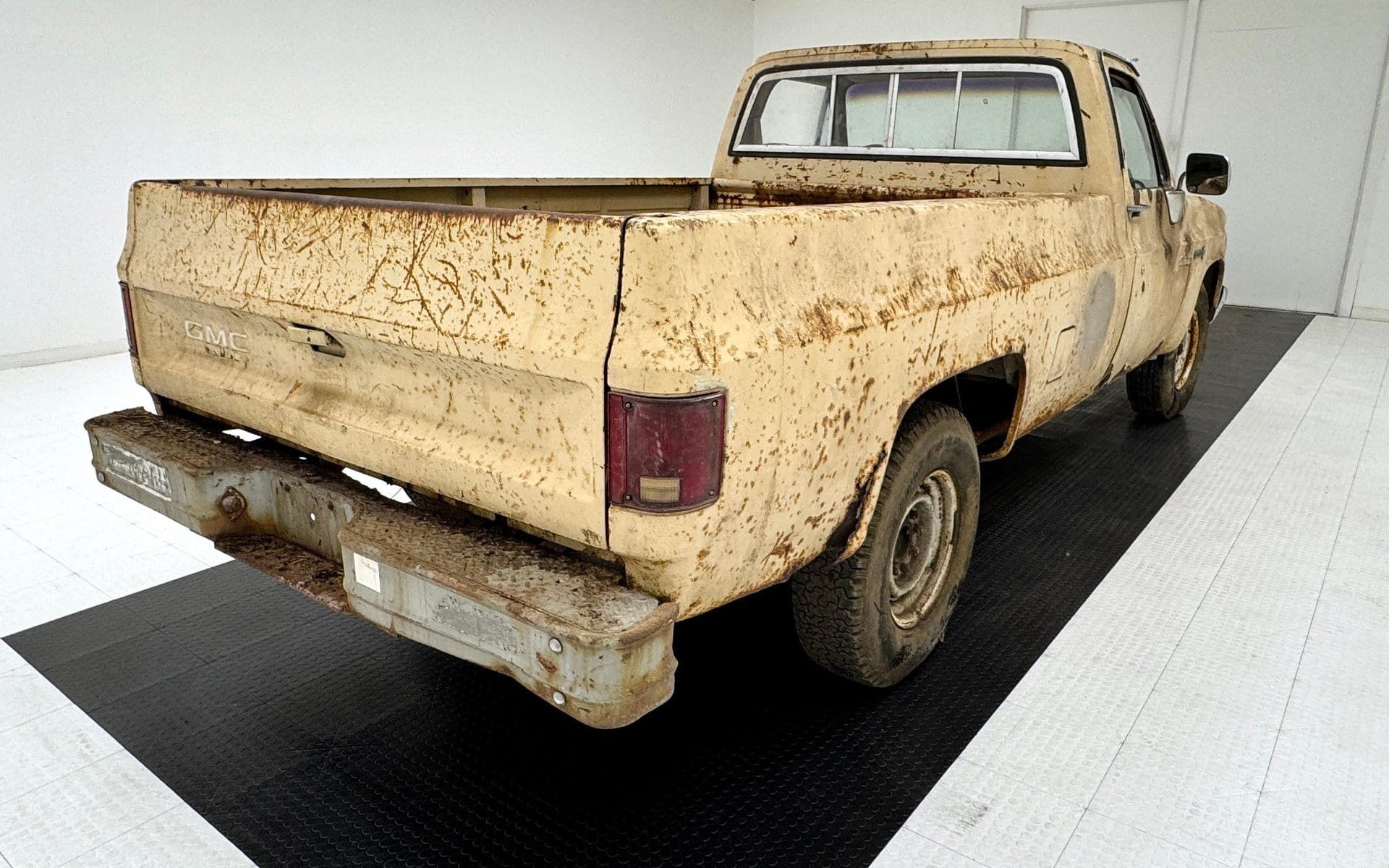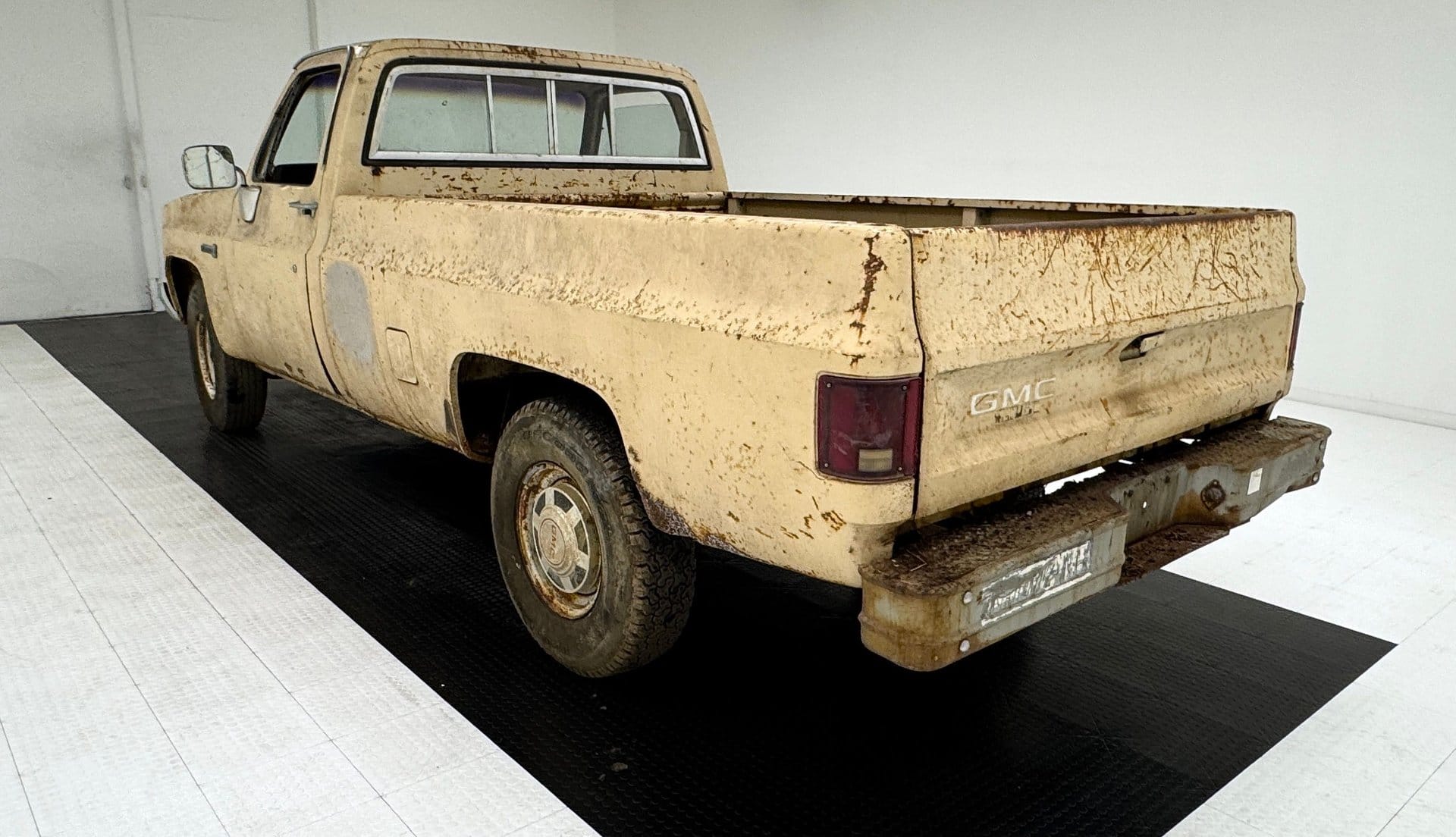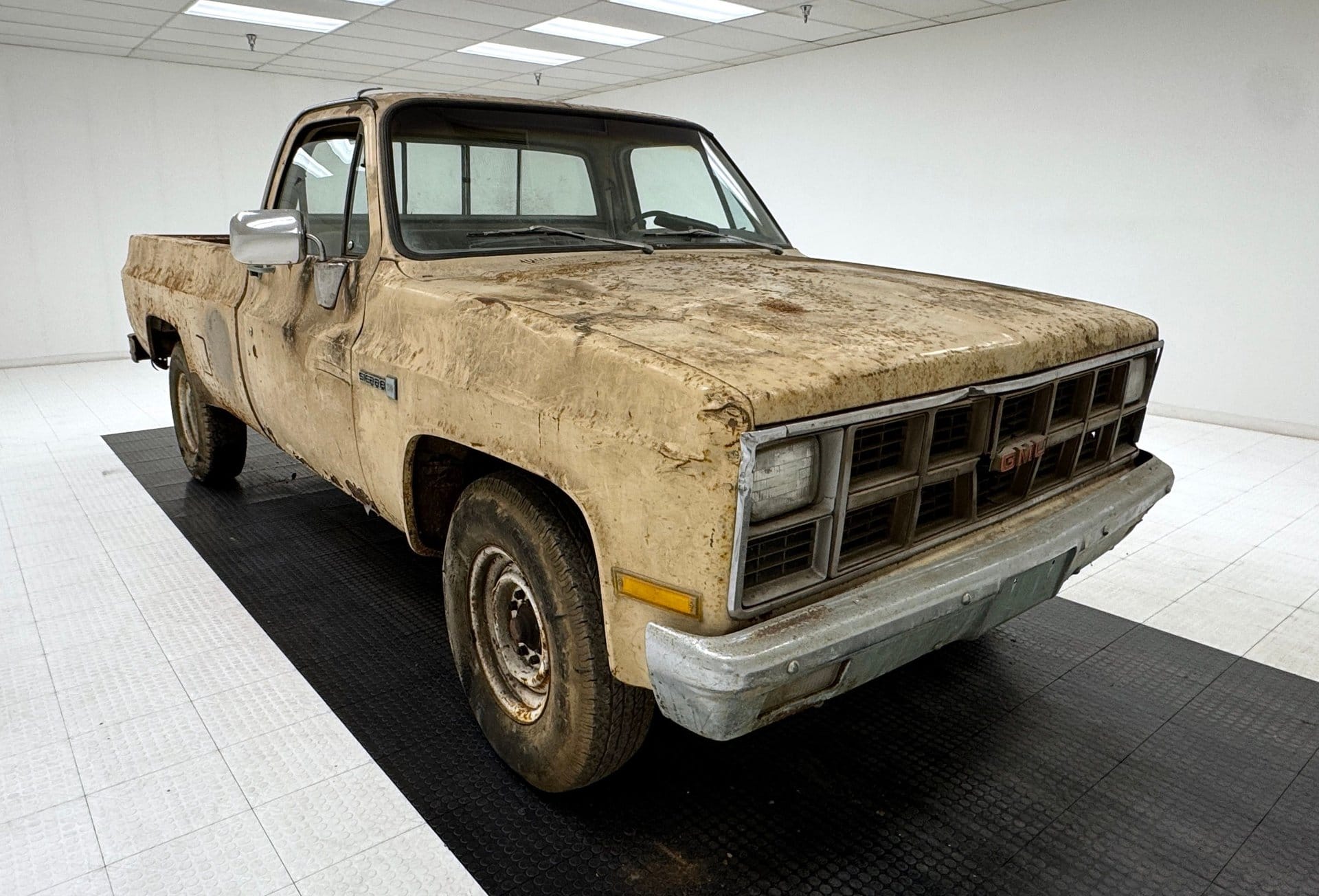 This particular Sierra is finished in Almond and displays the wear expected from a vehicle that has spent years outside regular use. The exterior shows extensive rust spots, dents, scratches and fading across multiple panels. Corrosion is present on the fenders, doors and rocker panels, with some areas showing rust holes and thinning metal.