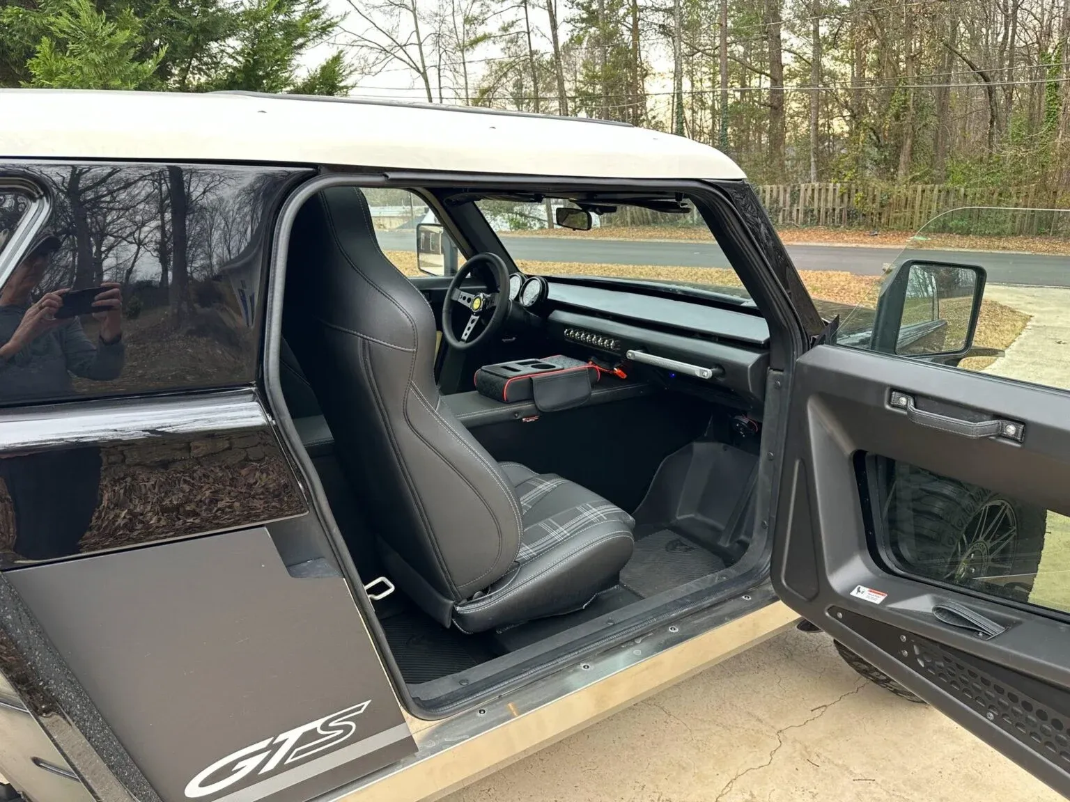 Inside, the vehicle features a fully enclosed cabin equipped with heating, air conditioning and heated seats. The interior design favors analog gauges and aircraft-style toggle switches rather than touchscreen interfaces. Each of the four occupants is secured by a four-point harness.