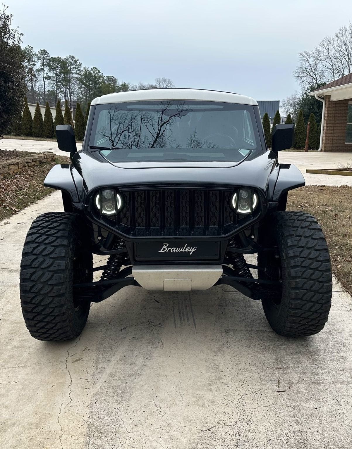 The vehicle’s aluminum unibody chassis is designed to keep overall weight low while maintaining rigidity. The battery pack is mounted low within the structure, helping lower the center of gravity and improve stability during off-road driving. Dual A-arm suspension is used at each corner, providing 21 inches of wheel travel through long-travel dampers. The Brawley rides on 35-inch mud-terrain tires mounted to 18-inch aluminum wheels and offers 18 inches of ground clearance.