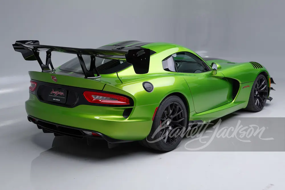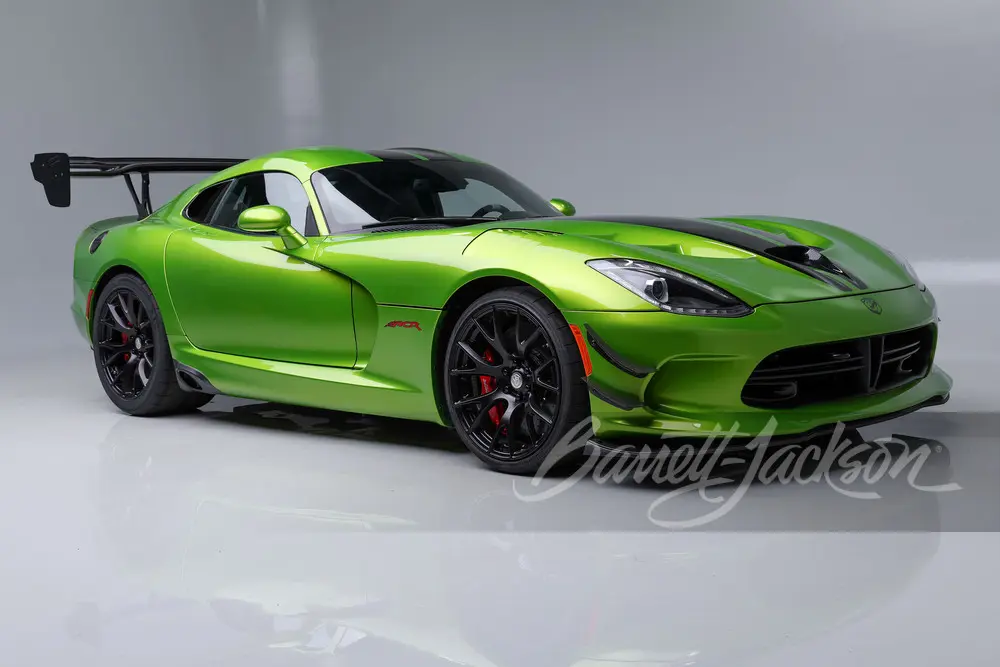 A final-year Dodge Viper ACR finished in the rare Snakeskin Green Edition is set to cross the auction block without reserve, representing one of the last and most extreme expressions of Chrysler’s modern performance icon. Showing just 812 actual miles, the 2017 model comes from the closing chapter of Viper production and reflects decades of racing influence distilled into a road-legal, track-focused machine.