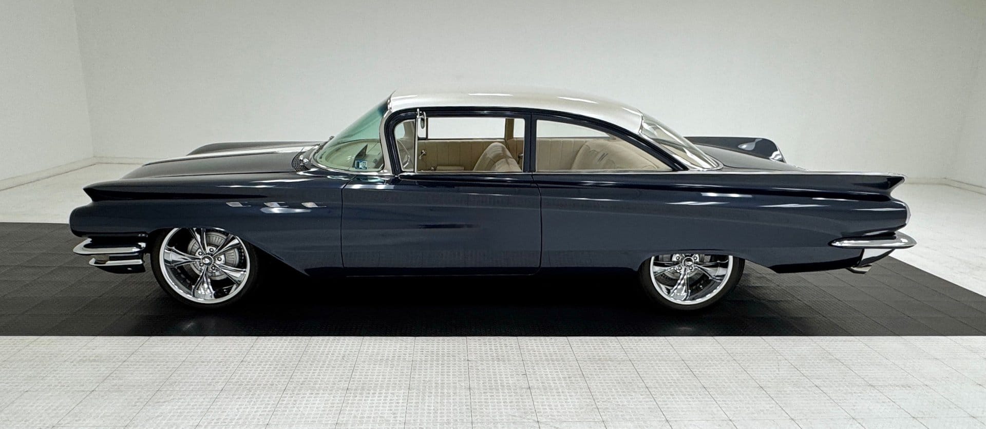 This restored two-door sedan, finished in Nautical Blue with a contrasting white roof, showcases the dramatic lines and wraparound glass that defined early-1960s styling. The exterior gleams with fresh chrome, polished detailing, and 20-inch Ridler wheels that bring a modern stance to the vintage design. A single minor paint bubble marks the only flaw in an otherwise show-ready finish.