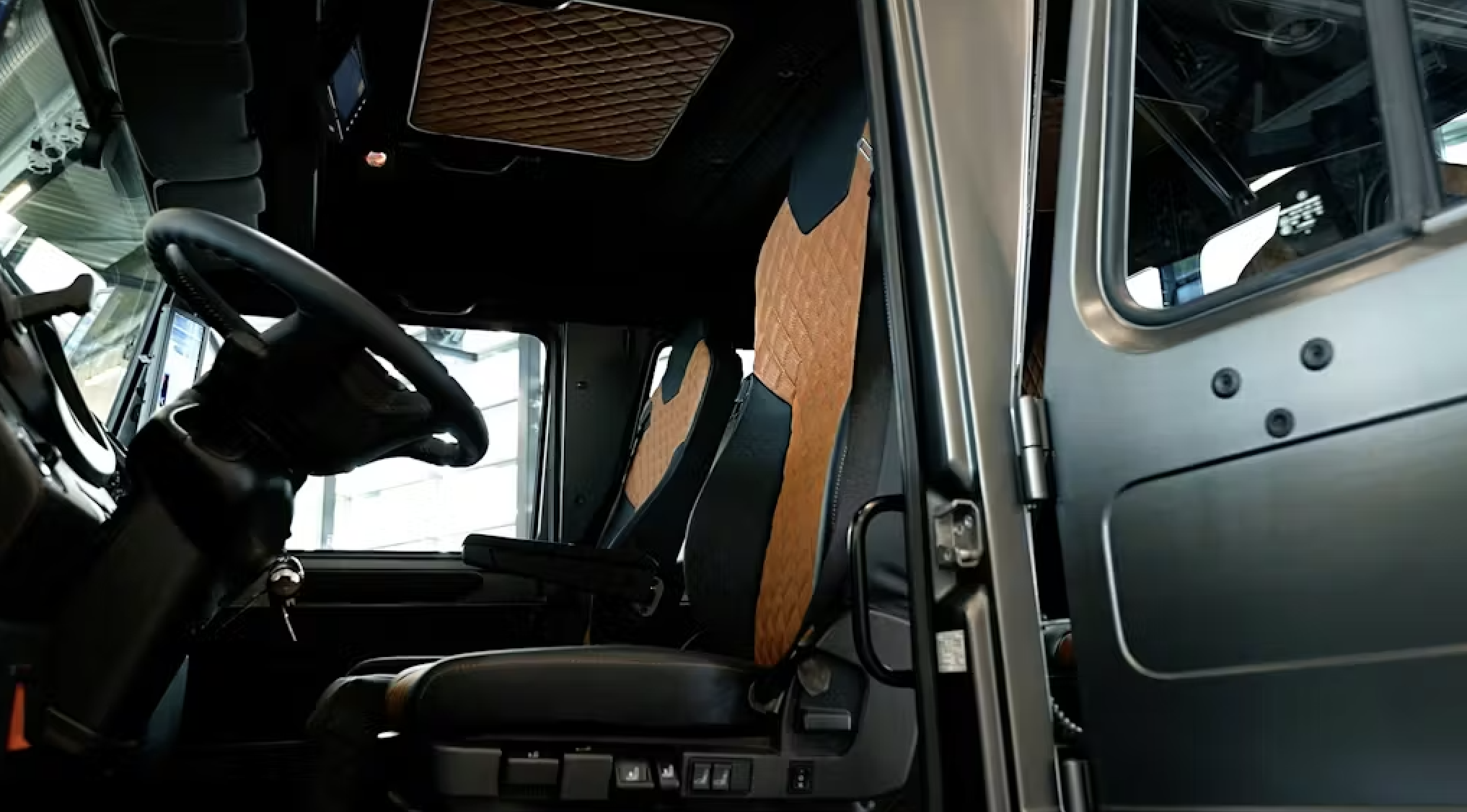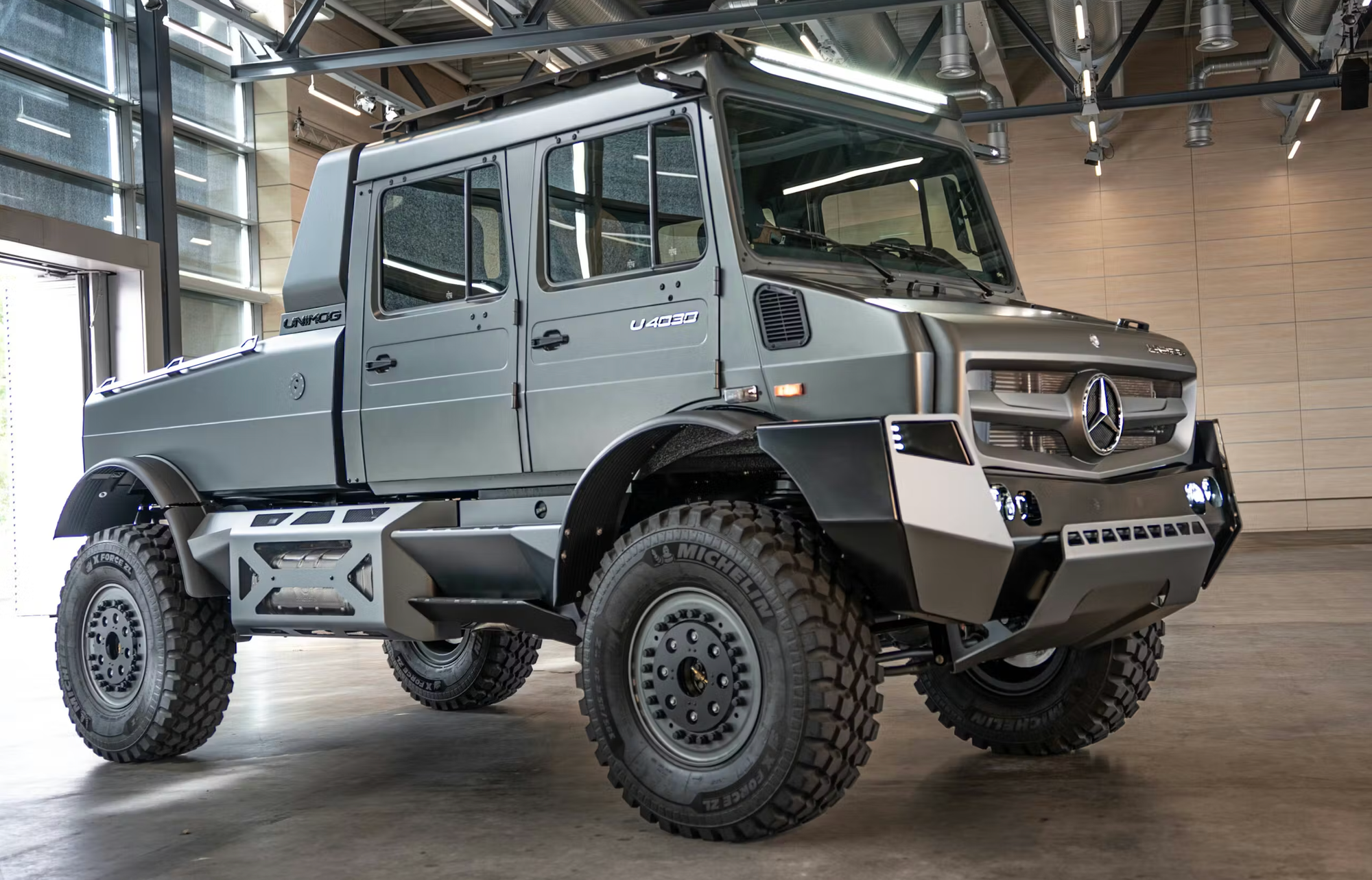 The double-cab interior seats four and is finished entirely in leather, including the floor mats. Ambient mood lighting adds a luxury touch rarely associated with heavy-duty utility vehicles. Exterior updates include LED headlights, beadlock aluminum wheels, matte gray paint, and a full-width roof-mounted light bar, giving the Unimog a modern and purposeful appearance.