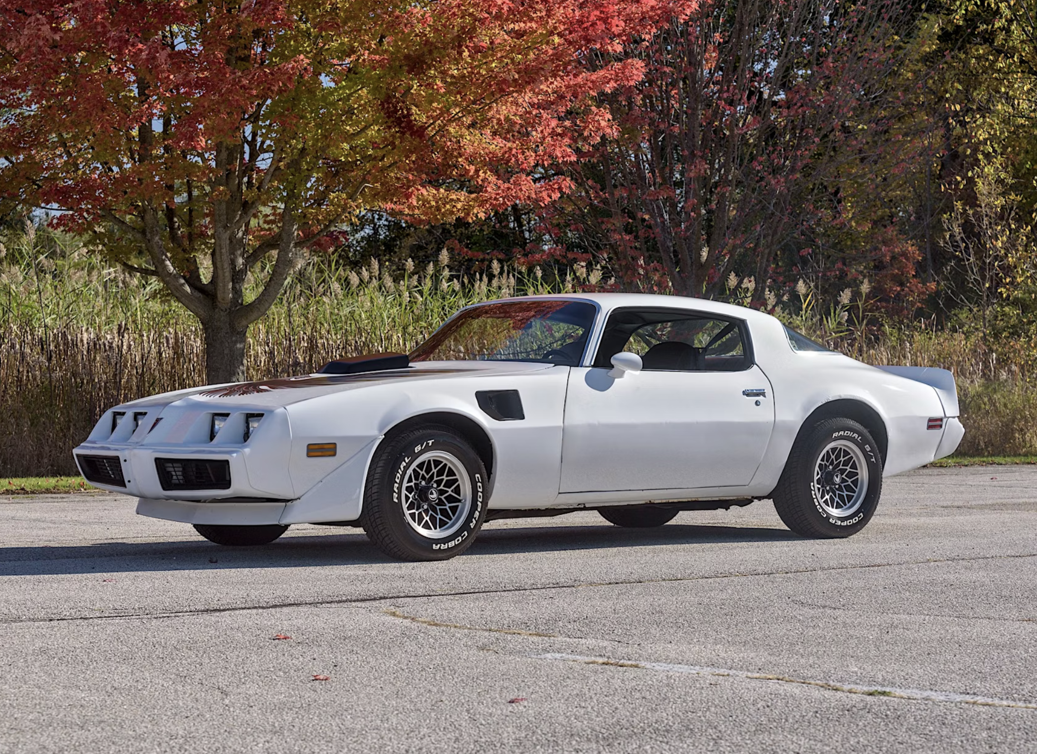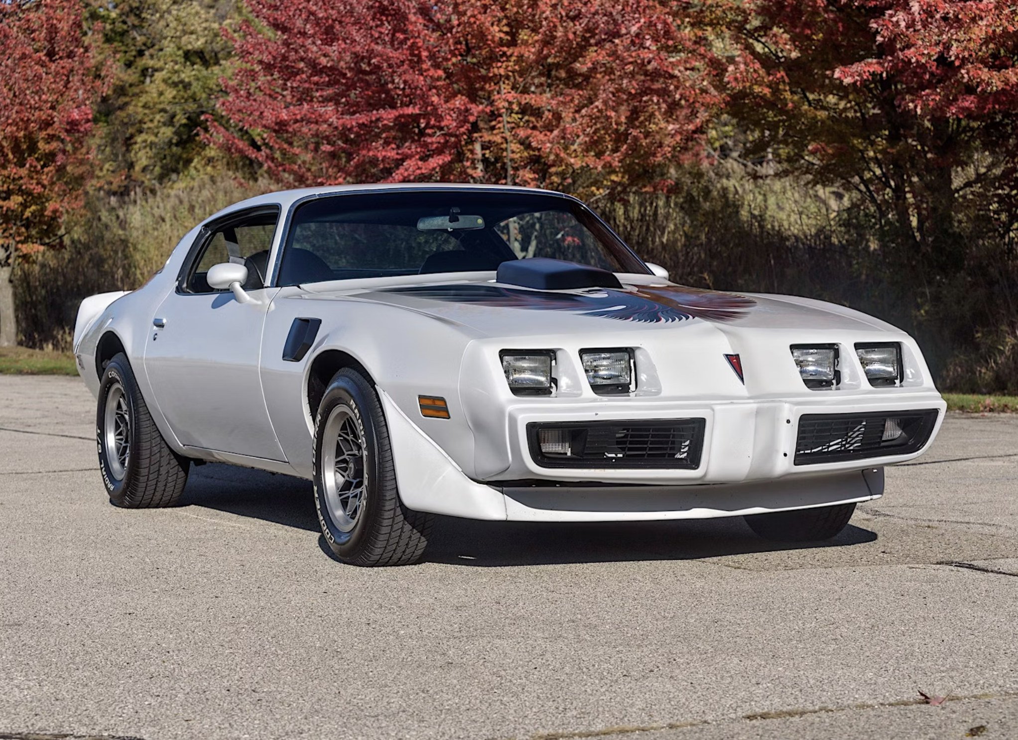 Originally built in Los Angeles and delivered with a 301-cubic-inch V8, the car has undergone a significant transformation under prior ownership. The blue factory finish was resprayed in white and accented with black graphics, including the unmistakable “screaming chicken” hood decal that became a pop-culture symbol after the Smokey and the Bandit films.