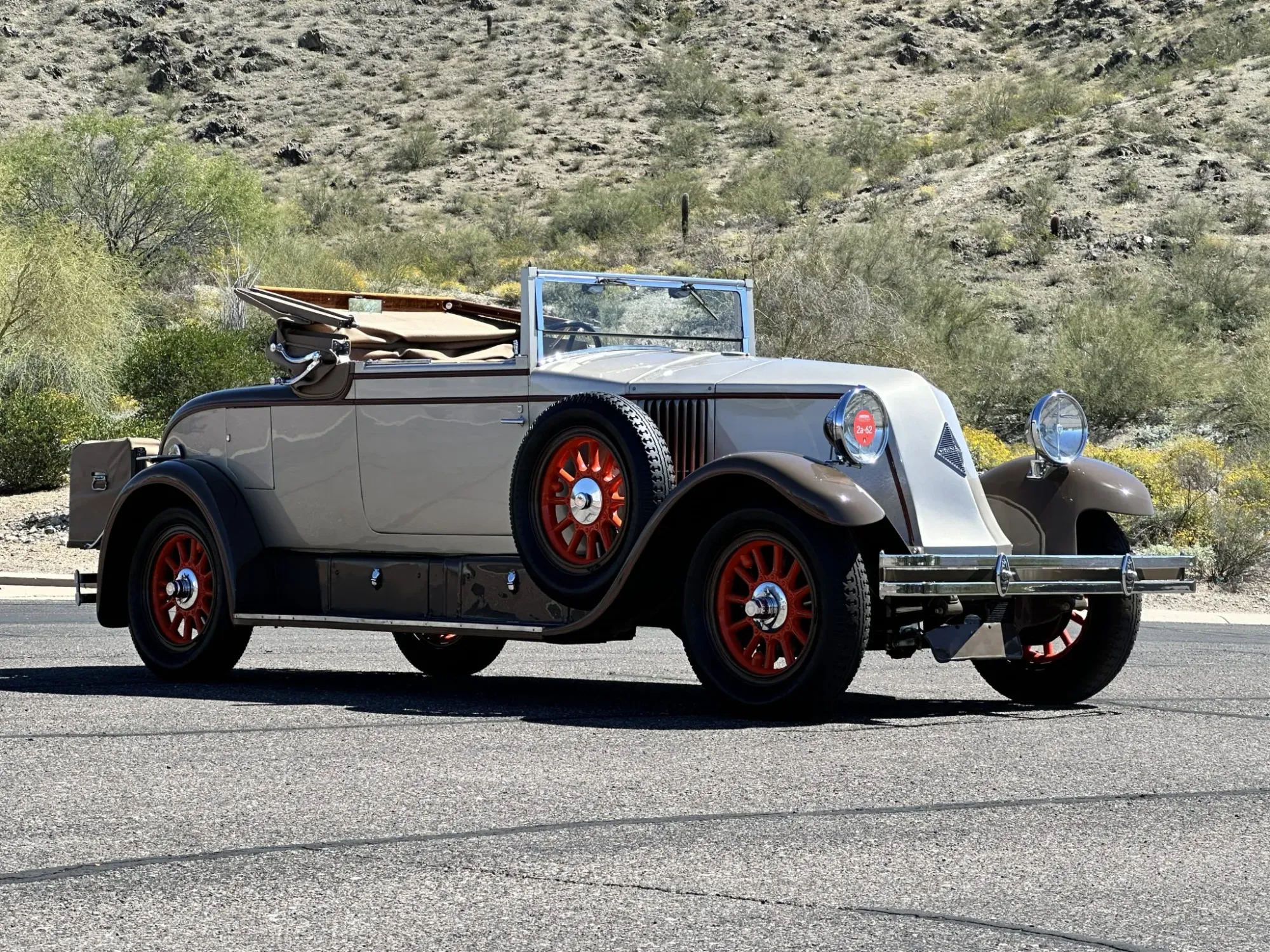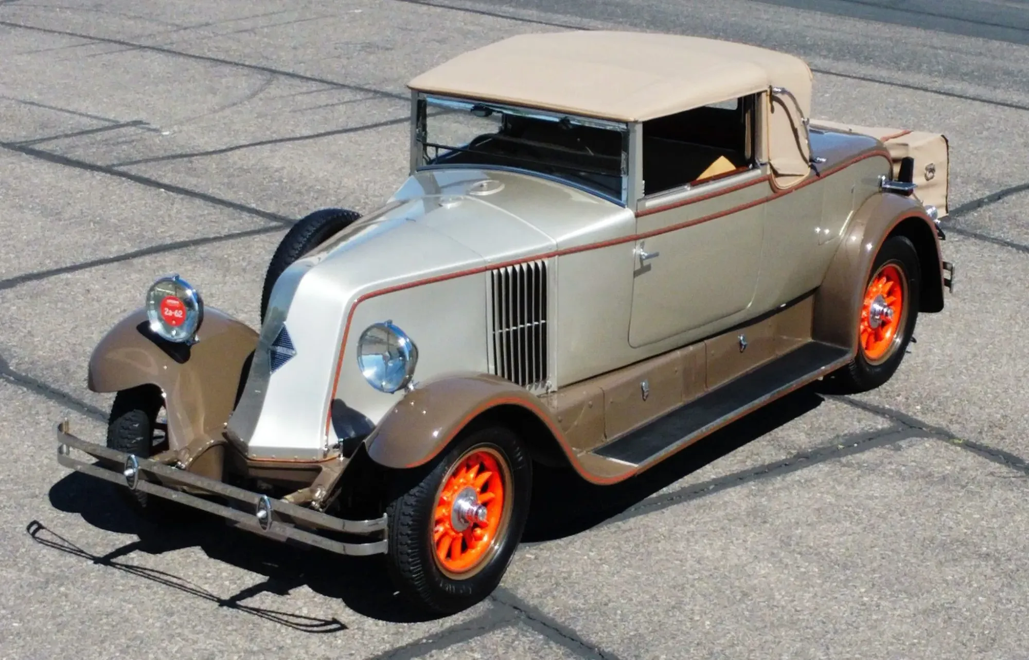 Finished in a striking beige and brown color scheme, the Renault is powered by a 3,181cc L-head inline-six engine paired with a four-speed manual transmission. It features mechanically actuated four-wheel drum brakes with servo assistance, hydraulic shock absorbers, and distinctive orange-painted wood-spoke wheels. The interior and rumble seat are upholstered in tan leather, complementing the elegant wooden dash and period-correct Jaeger instruments, albeit some of which are non-functional.