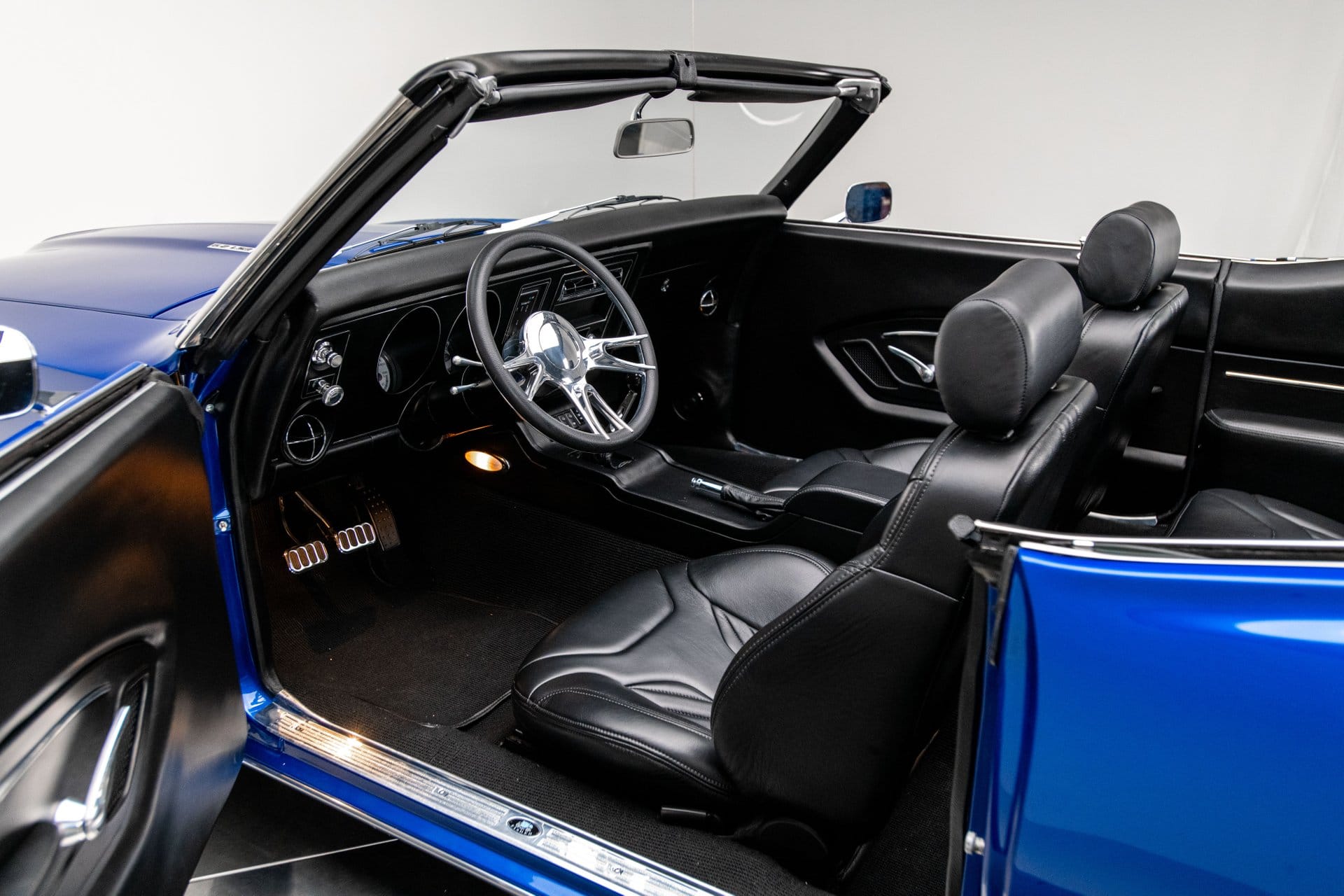 The classic muscle car retains its iconic silhouette but has been carefully refined with modern enhancements. Finished in a striking Electron Blue metallic exterior, the convertible highlights the Firebird’s original lines while incorporating premium details such as updated chrome, a high-quality power-operated soft top, and custom Schott wheels. The overall design approach preserves the car’s heritage while elevating its visual presence.