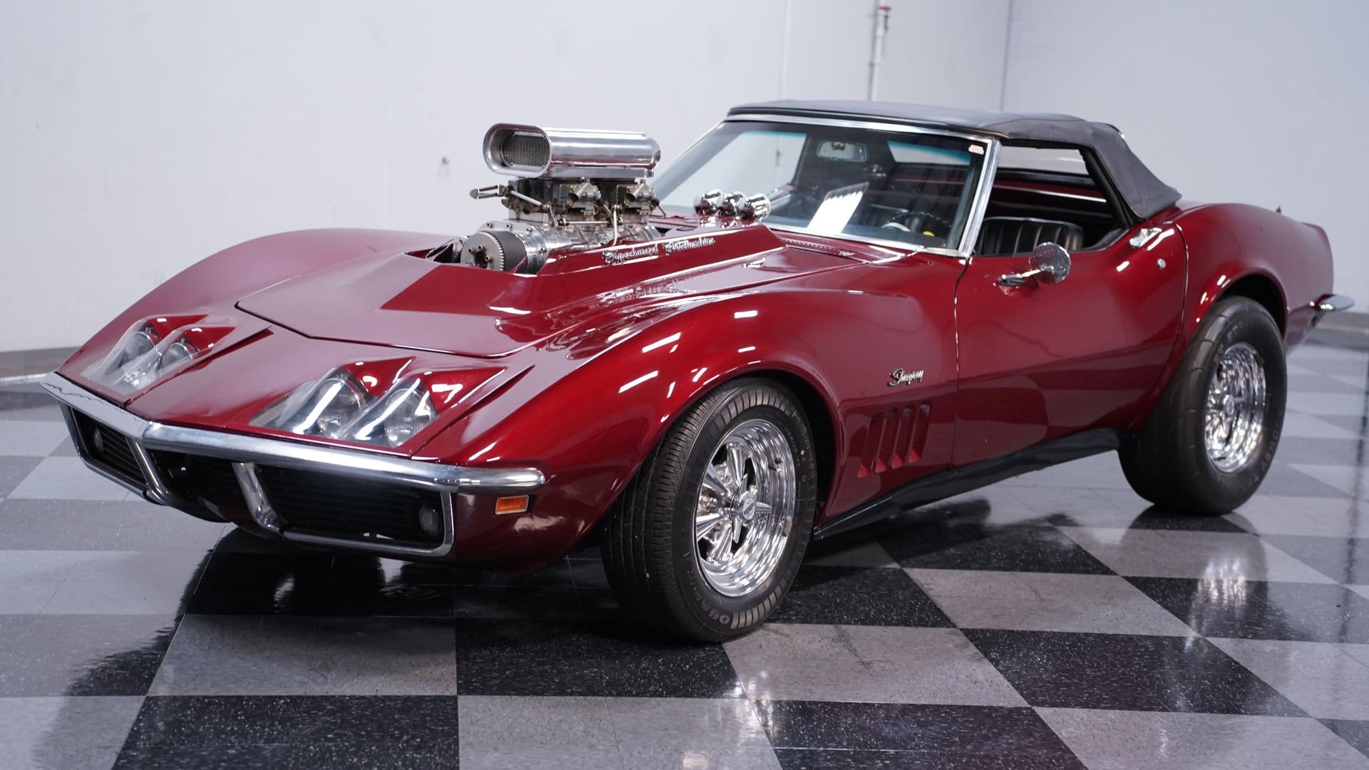 Finished in Brilliant Red metallic, the two-door convertible retains the familiar lines of the 1969 Corvette while incorporating substantial performance-focused upgrades. Power comes from a supercharged 406-cubic-inch V8 running on gasoline, paired with a four-speed manual transmission. The combination positions the car firmly in the Pro Street category, blending classic muscle car aesthetics with drag-inspired performance hardware.