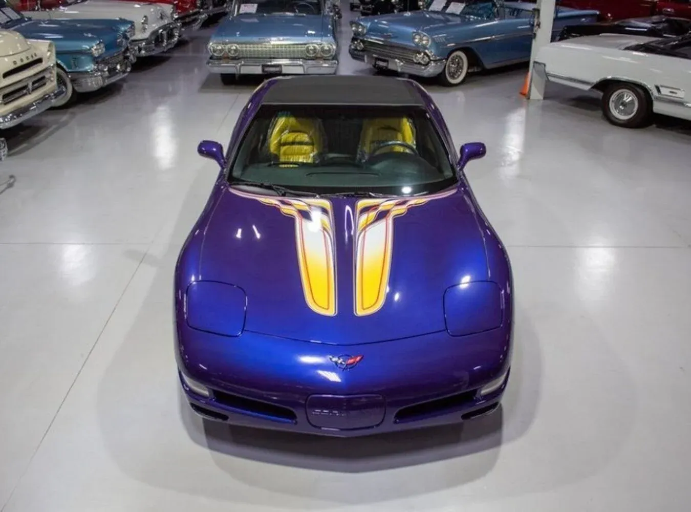 Inside, the Corvette features two-tone black and yellow leather seats with power adjustment, dual-zone climate control, power accessories and an AM/FM/CD stereo. The cabin’s upholstery, carpeting and instrumentation appear untouched, consistent with the car’s status as a preserved collector piece.