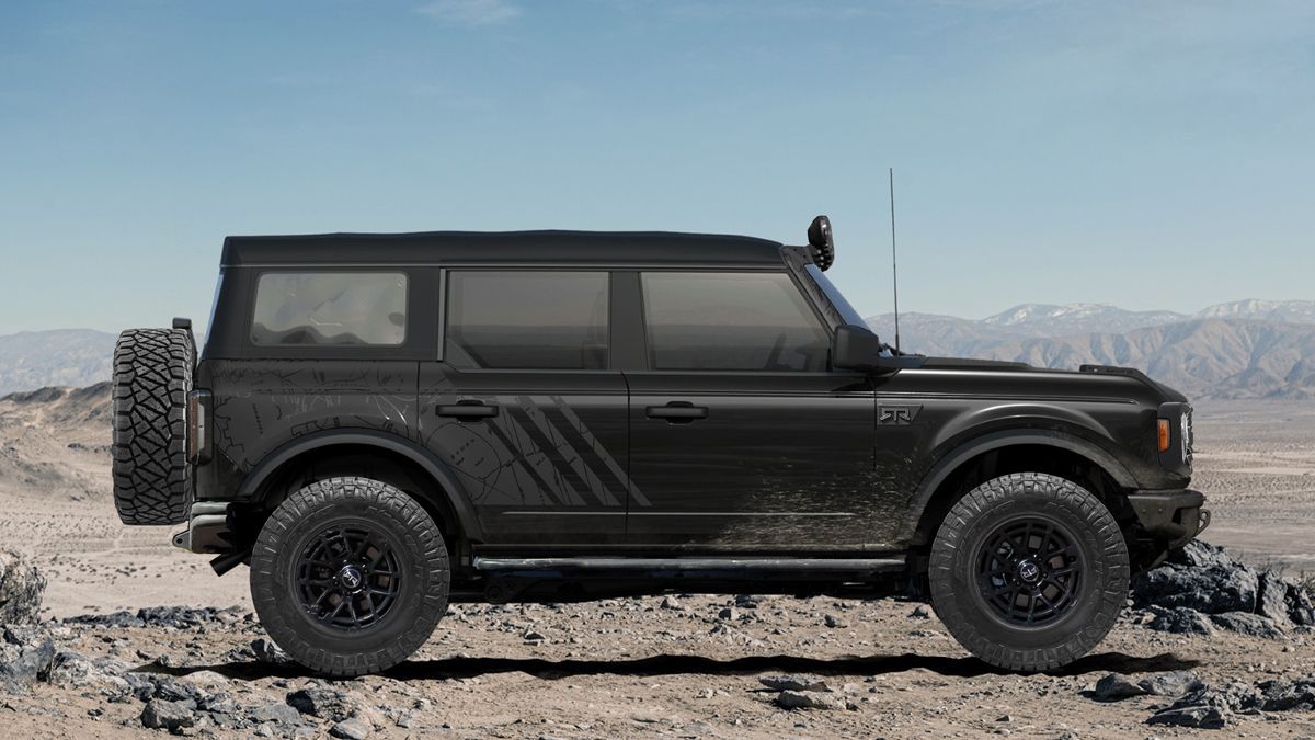 RTR customized the 2021 Bronco with upgraded lighting, rock sliders, a tubular bumper, accessory mount and tire carrier at the rear, graphics package, leather interior, beefy Nitto tires, and a ton more.