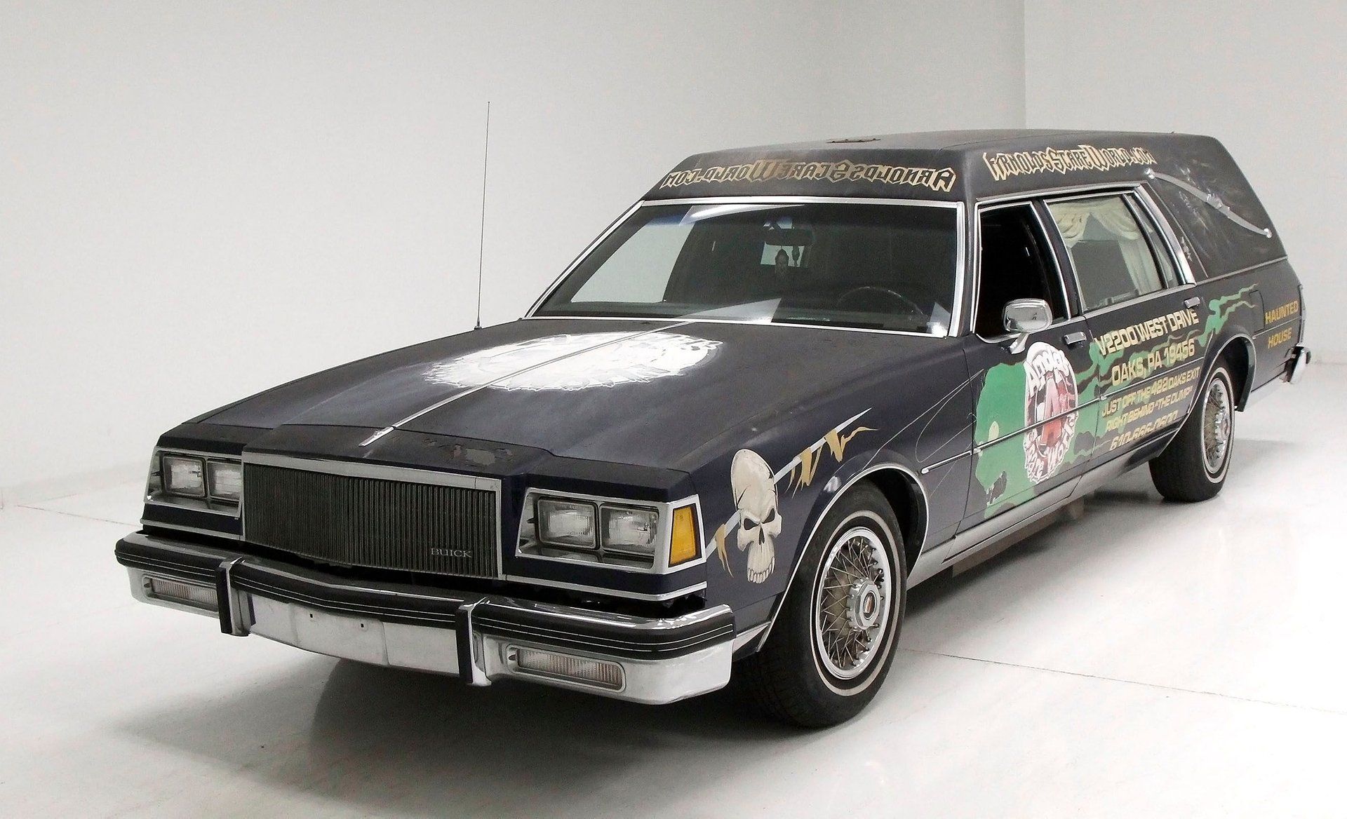 Transformed and used for many years as a working funeral parlor hearse, it was then retired and made into a promotional car for a haunted house. With all the interior made to accommodate and transfer a casket and its occupant, and underpinnings to handle the extra weight.
