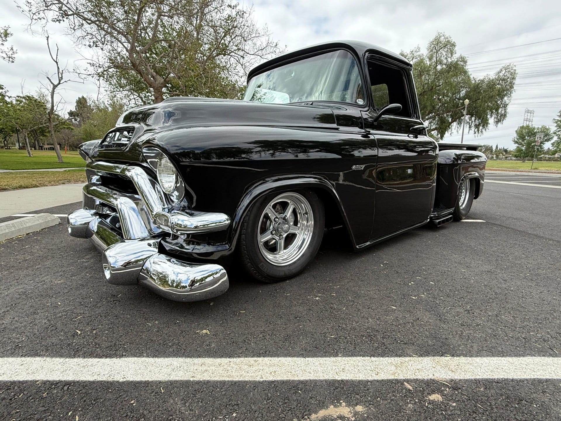 This blown 1956 GMC 100 RestoMod is a show-stopping SoCal custom built around a supercharged 427ci V8 with dual Demon carbs and a Mooneyham 671 blower. Featuring a 700R4 overdrive transmission, air ride suspension, Wilwood disc brakes, and a fully custom leather interior, it blends jaw-dropping performance with street-ready comfort. Finished in Tuxedo Black with a one-off hydraulic lift bed and detailed from top to bottom, this professionally built hot rod is a true attention-grabber with less than 5,000 miles since completion.