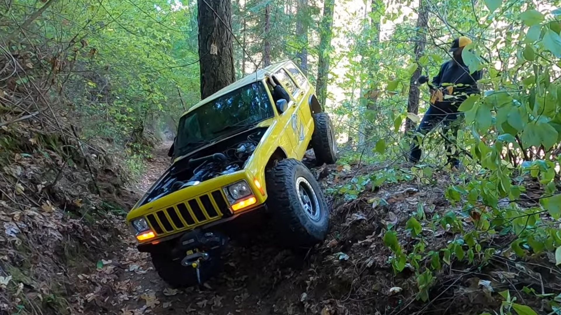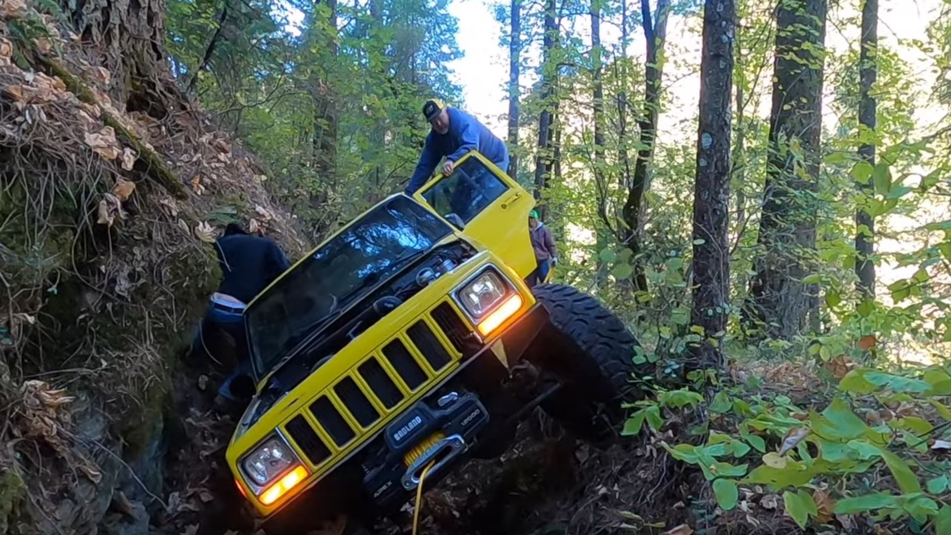 Just to get their Jeep Cherokee XJ lovingly called The Banana to the Suzuki, these guys have to cut down many small trees, trim limbs, move some large rocks, and do other trail maintenance. Still, it’s such a tight squeeze that the Jeep takes some damage, both going in and coming out. Since they’re getting ready to do some big modifications on the thing they’re not so concerned about the dents and scrapes, but it’s still cringe-inducing to watch.