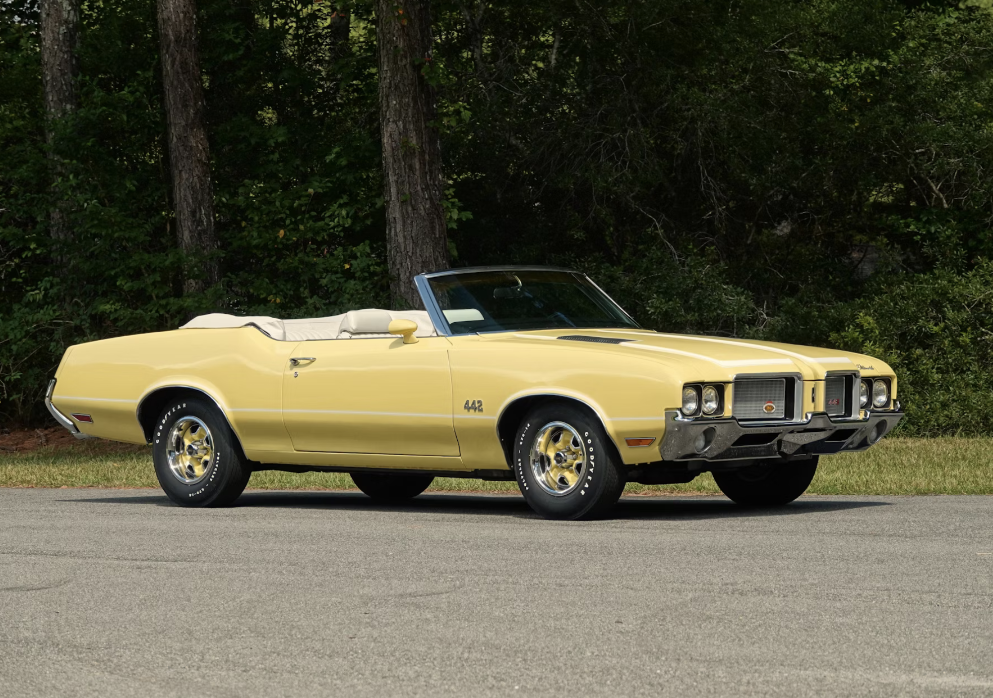 Moving into the 1970s, the 35k-mile, one-owner 1972 Cadillac Coupe DeVille captures peak personal luxury, while the 1-of-1,171 1972 Oldsmobile Cutlass Supreme 442 Convertible adds muscle to the mix — one of the last of its breed before emissions and insurance pressures changed the game.