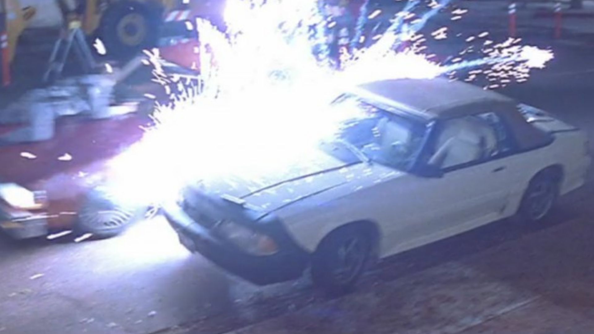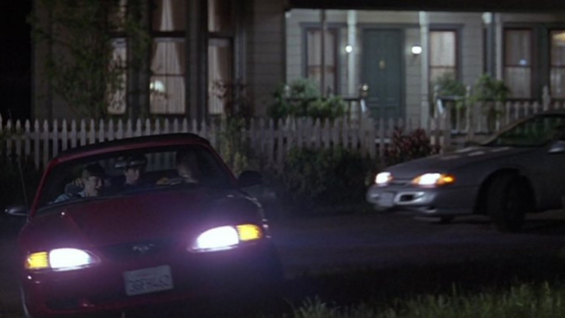 During that action sequence with the detective hanging onto the Caprice’s hood, shooting into the cabin, Ghostface tries throwing him off by hitting different objects. One of those is a 1987 Ford Mustang GT, which makes sparks fly. Is that a metaphor? Sure, why not. Also, it has a black bra on it – remember those things everyone foolishly thought were great?