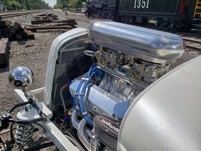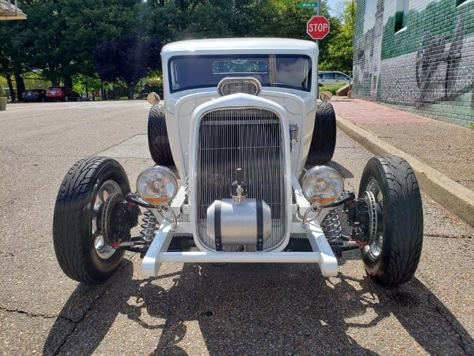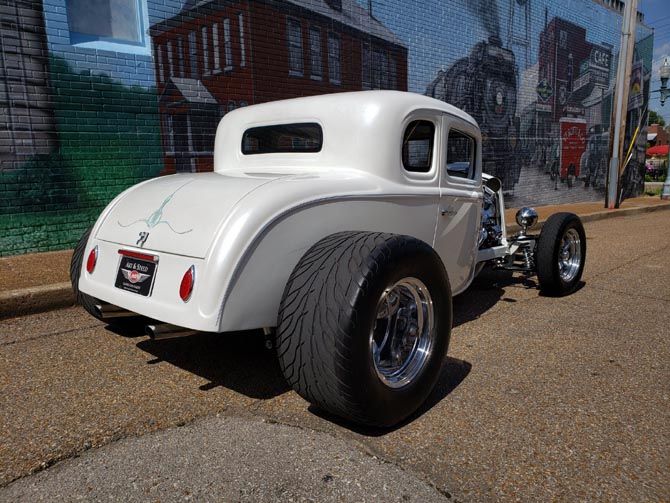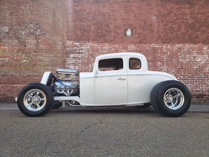A modest chop and exposed engine are classic hotrod cues, but this car really stands out with its Diamond White Pearl paint job and intricate pinstriping down the sides and on the trunk lid. From there, this Ford boasts a polished set of American Racing torque thrust wheels wrapped in Mickey Thompson tires including massive 15-inch wide rubber in the back! The canted radiator and blower-like air cleaner housing finish off this '32 Ford's incredible look.