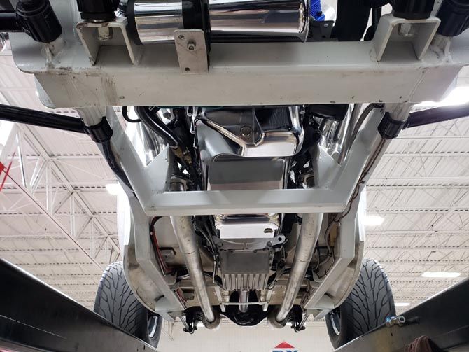 Complementing the attention-grabbing exterior, this hotrod gets a stylish and functional interior with accommodations that include custom-made bucket seats with pleated upholstery, leather-wrapped steering wheel, chrome tilt steering column and a billet gauge cluster. The custom center console houses a pair of stainless steel cup holders and a marine-style audio system.