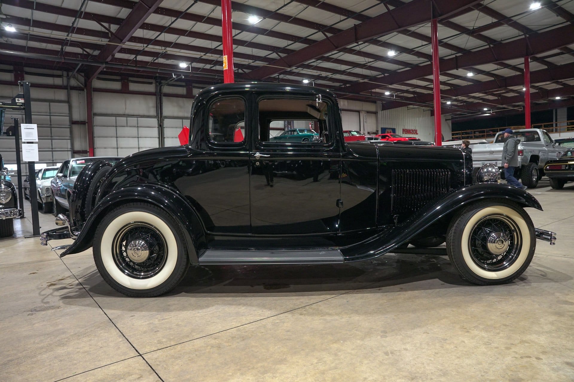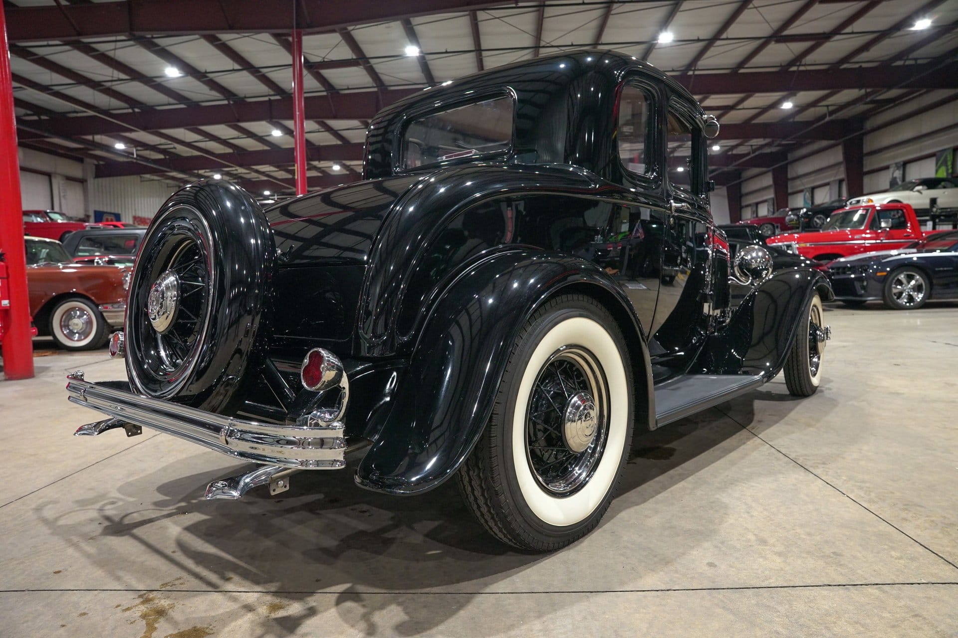 Finished in black, the coupe presents a timeless appearance defined by subtle chrome accents and traditional design elements. Chrome bumpers, black wire wheels with chrome hub caps, and wide whitewall tires contribute to its unmistakable vintage presence. A rear-mounted spare tire further reinforces the model’s classic character, aligning with the styling cues that made early Ford coupes icons of American automotive design.