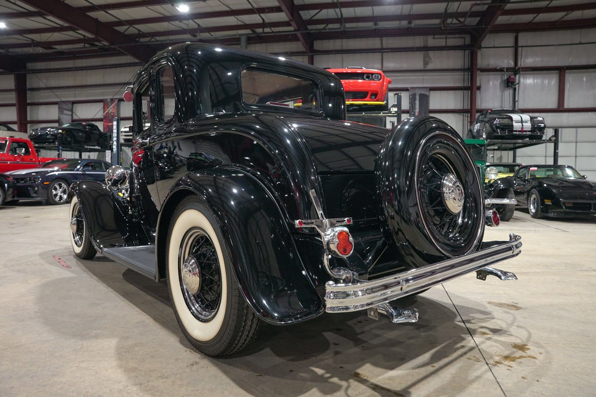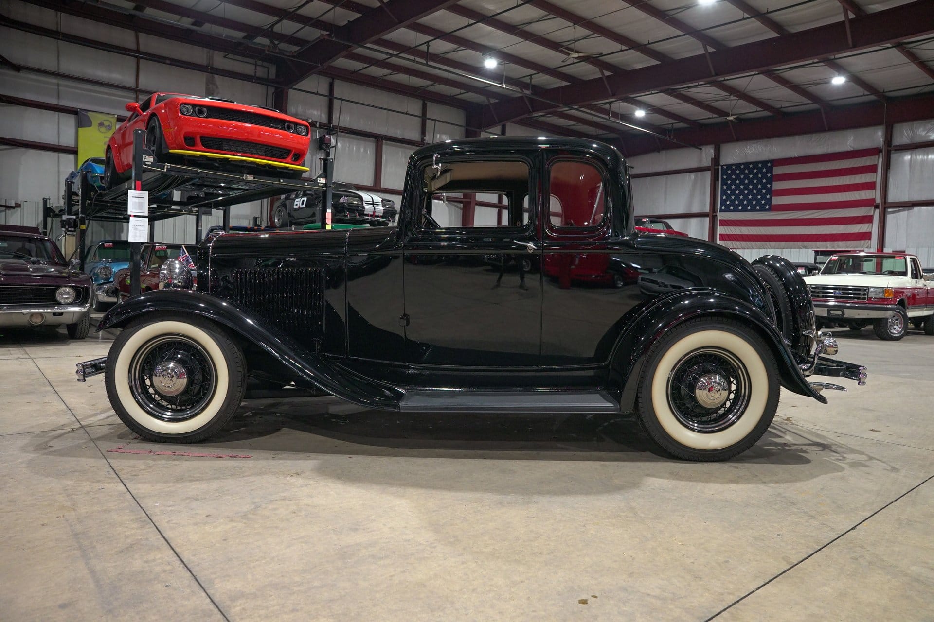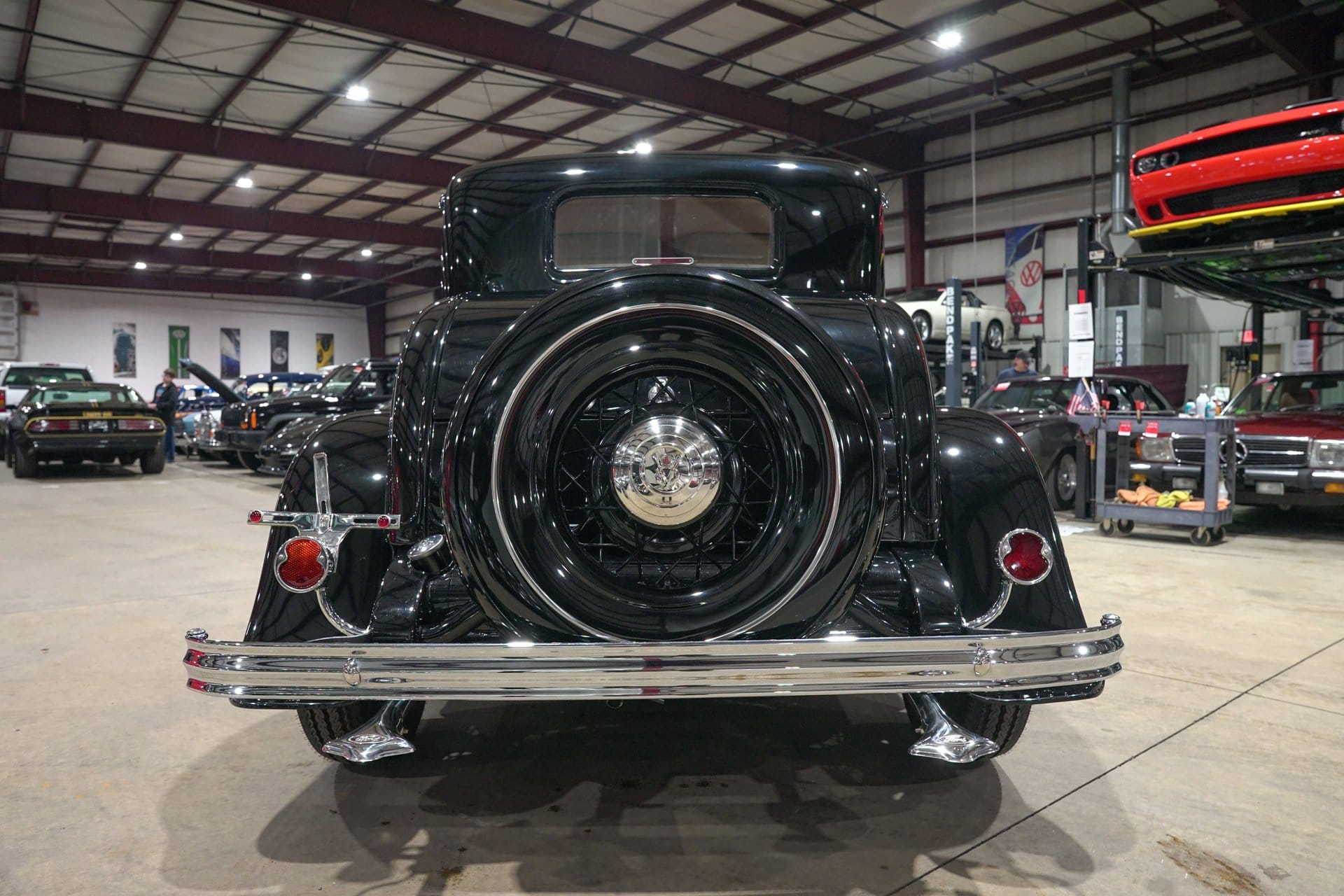 Finished in black, the coupe carries styling elements that highlight the clean lines and recognizable proportions that have made early Ford coupes some of the most sought-after classics in the collector car market. Chrome bumpers add contrast to the dark exterior, while black wire wheels fitted with chrome hub caps and wide whitewall tires complete the period-inspired appearance. A full mounted spare tire further reinforces the car’s traditional look.
