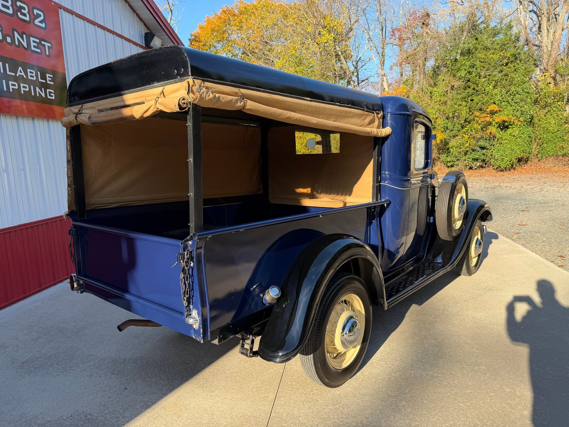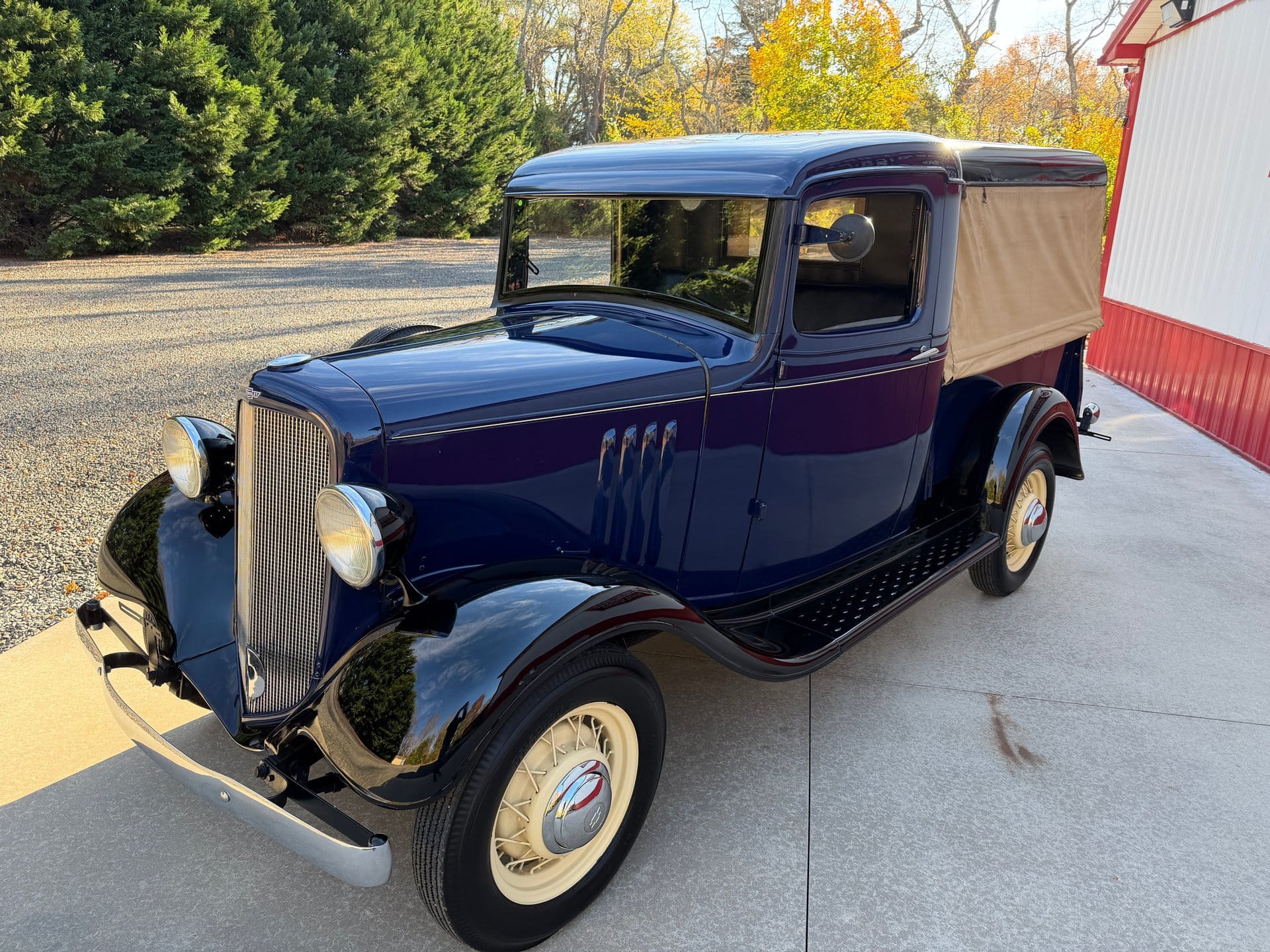 Under its hood, the truck carries a 206-cubic-inch inline six-cylinder engine linked to a 3-speed manual transmission, showcasing the simplicity and dependability that helped establish Chevrolet’s reputation among small business owners and tradesmen of the 1930s. The model’s period-correct blue finish with black fenders, cream wire wheels, and single side-mounted spare evoke its original working-class purpose while retaining timeless charm.