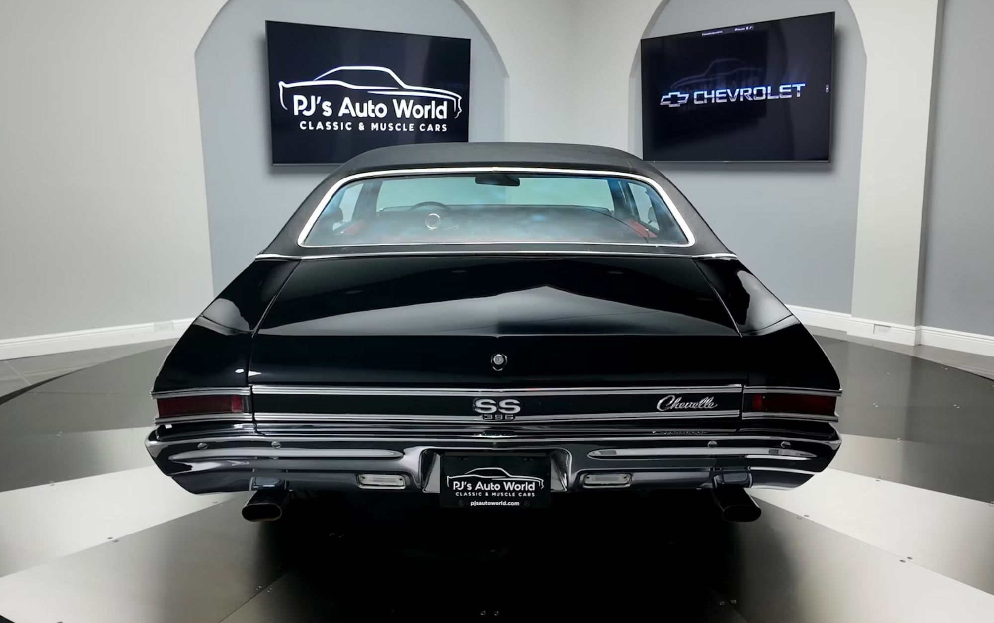 The exterior has been refinished in black and features SS 396 styling cues, including a twin-domed hood, black grille and rear panel, and appropriate badging. A black vinyl top tops the two-door Sport Coupe, while 15-inch Rally wheels wearing BF Goodrich tires complete the period look.