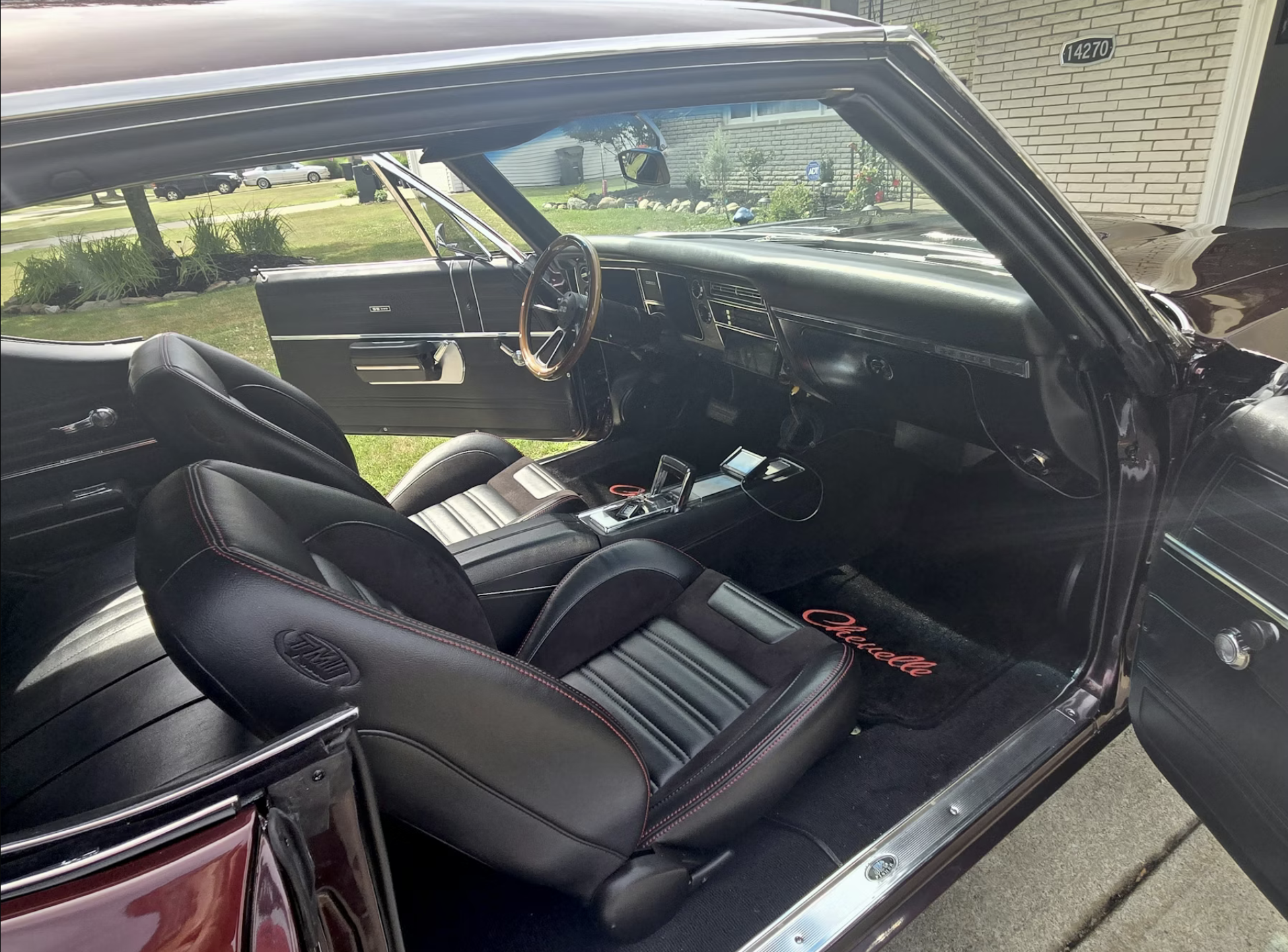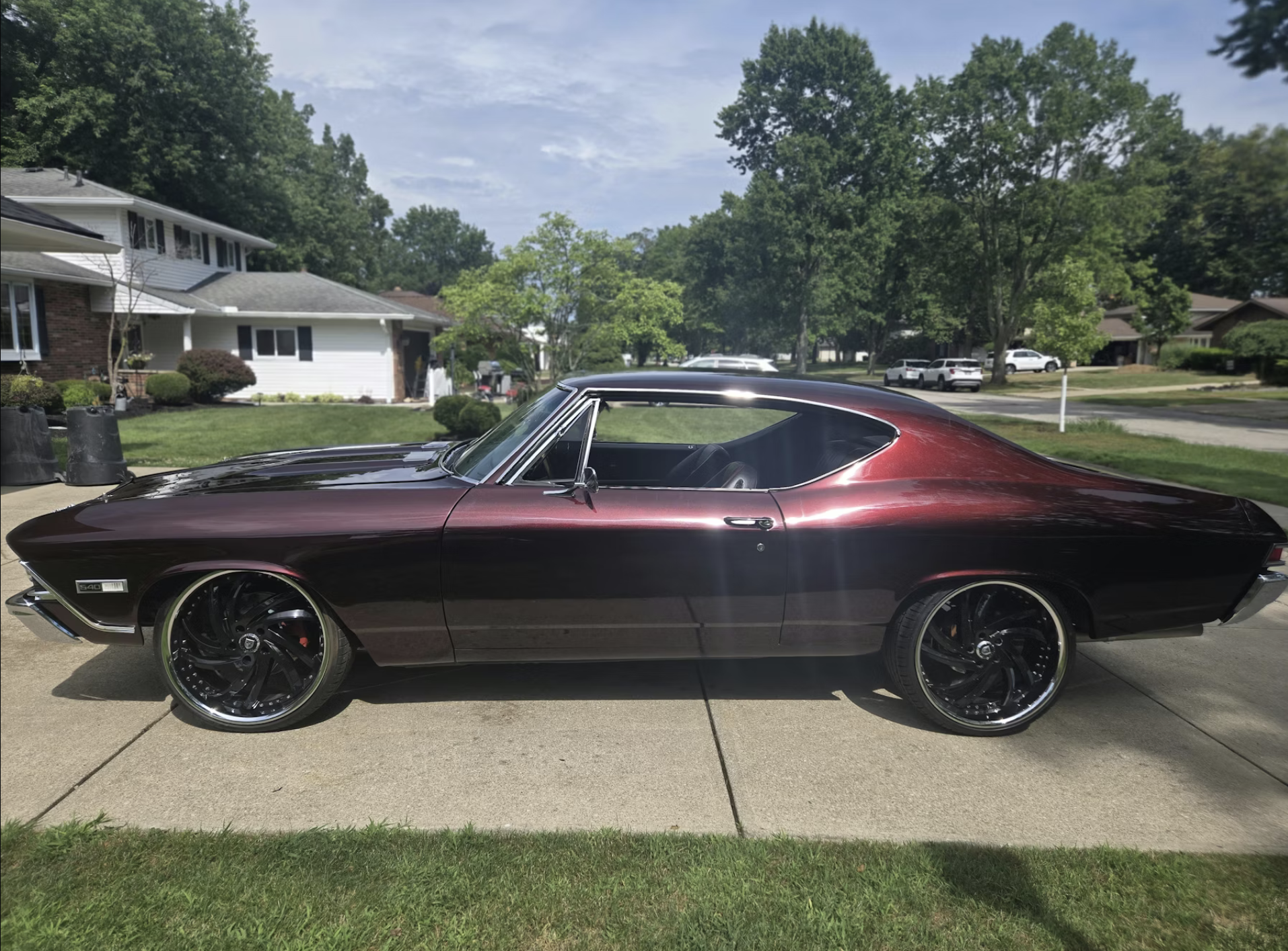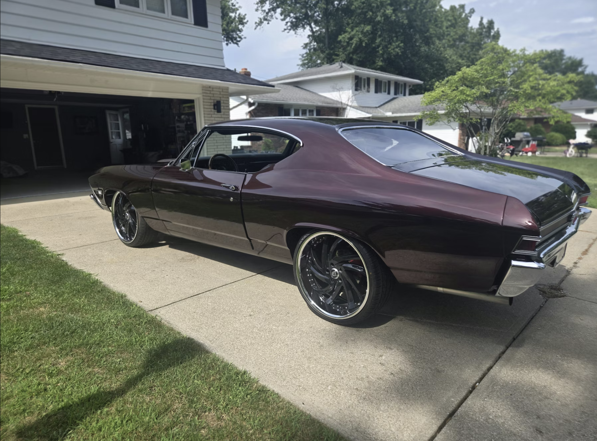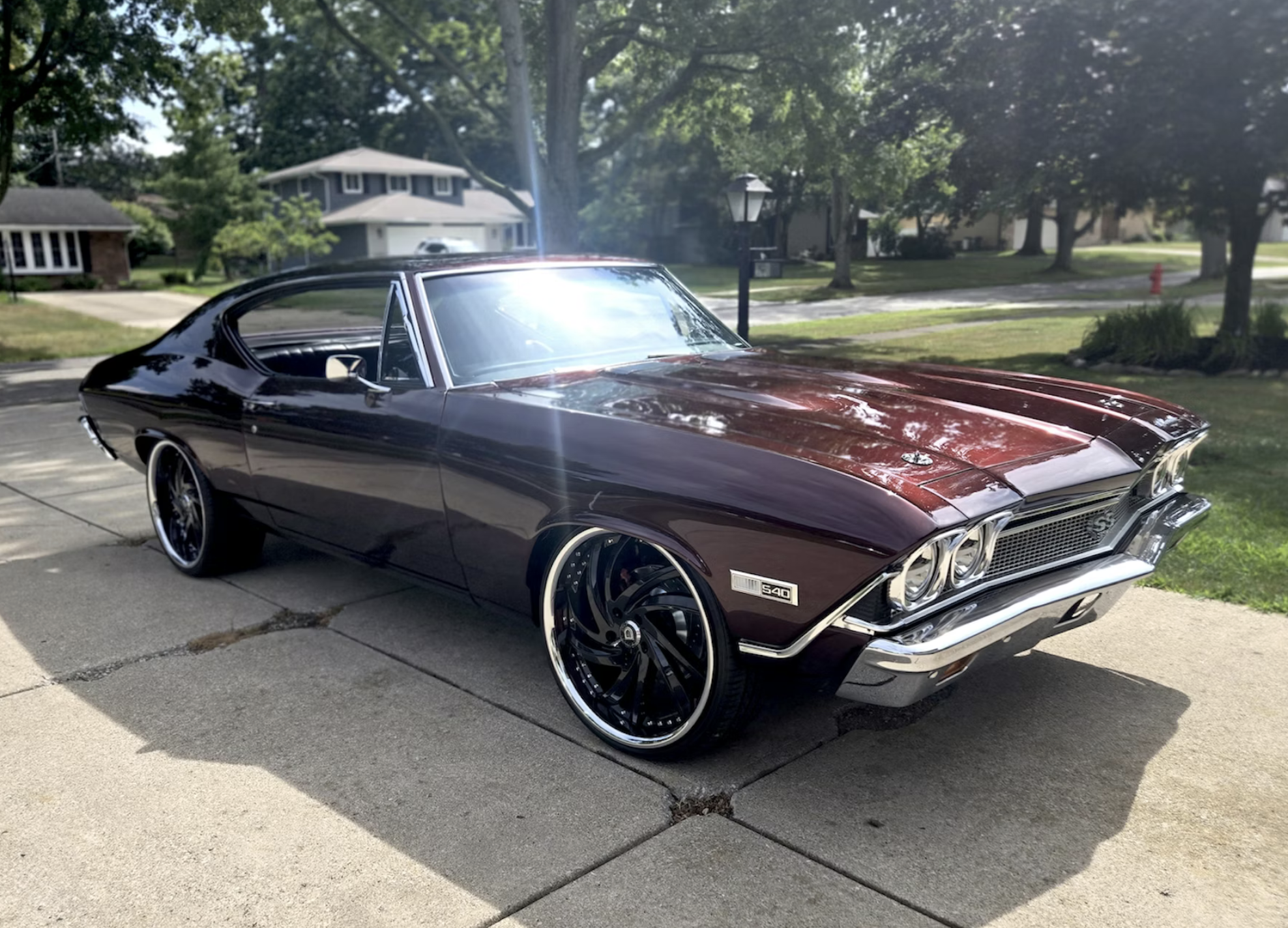 The exterior was refinished in 2025 in Dark Cherry with a Deltron clearcoat, giving the Chevelle a fresh appearance. Large Lexiani wheels, measuring 22 inches front and rear, fill the wheel arches and conceal the upgraded braking system. Inside, the black interior has been updated with TMI bucket seats, digital gauges, a tilt steering column, air conditioning, and a touchscreen stereo.