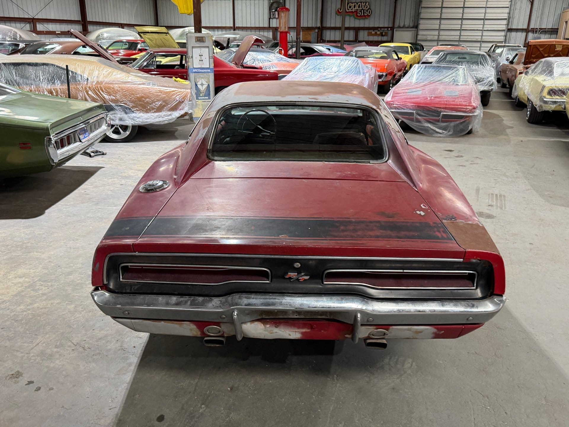 What sets this Charger apart visually is its factory R6 dark red exterior paired with a black vinyl top and red bucket seat interior. Even more unusual is the bright red tail stripe, a combination described as one of the only documented examples of any 1969 Charger wearing red paint with a red stripe. The seller notes that the configuration is likely unique, making the car particularly appealing to collectors focused on factory-correct color and trim combinations.