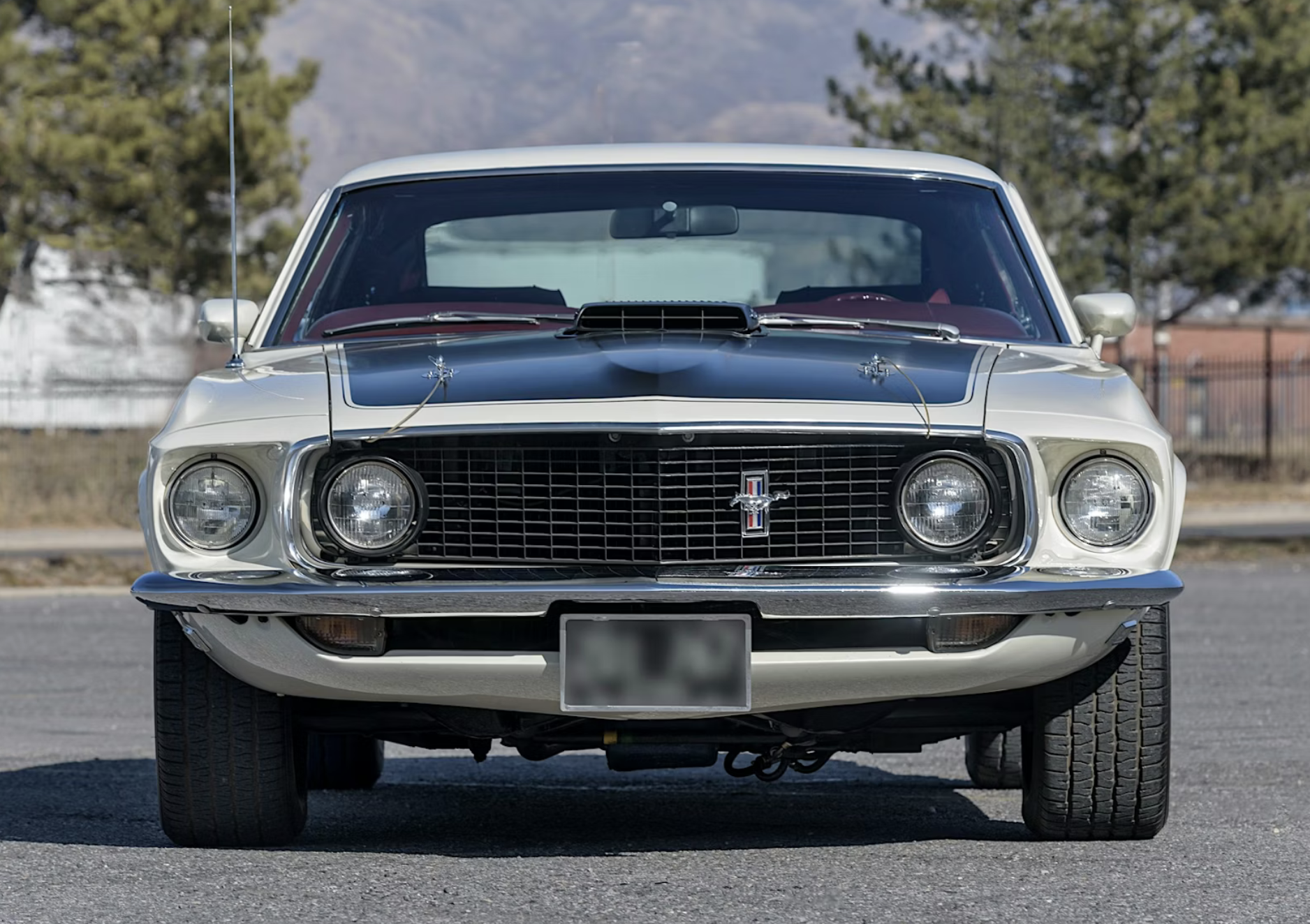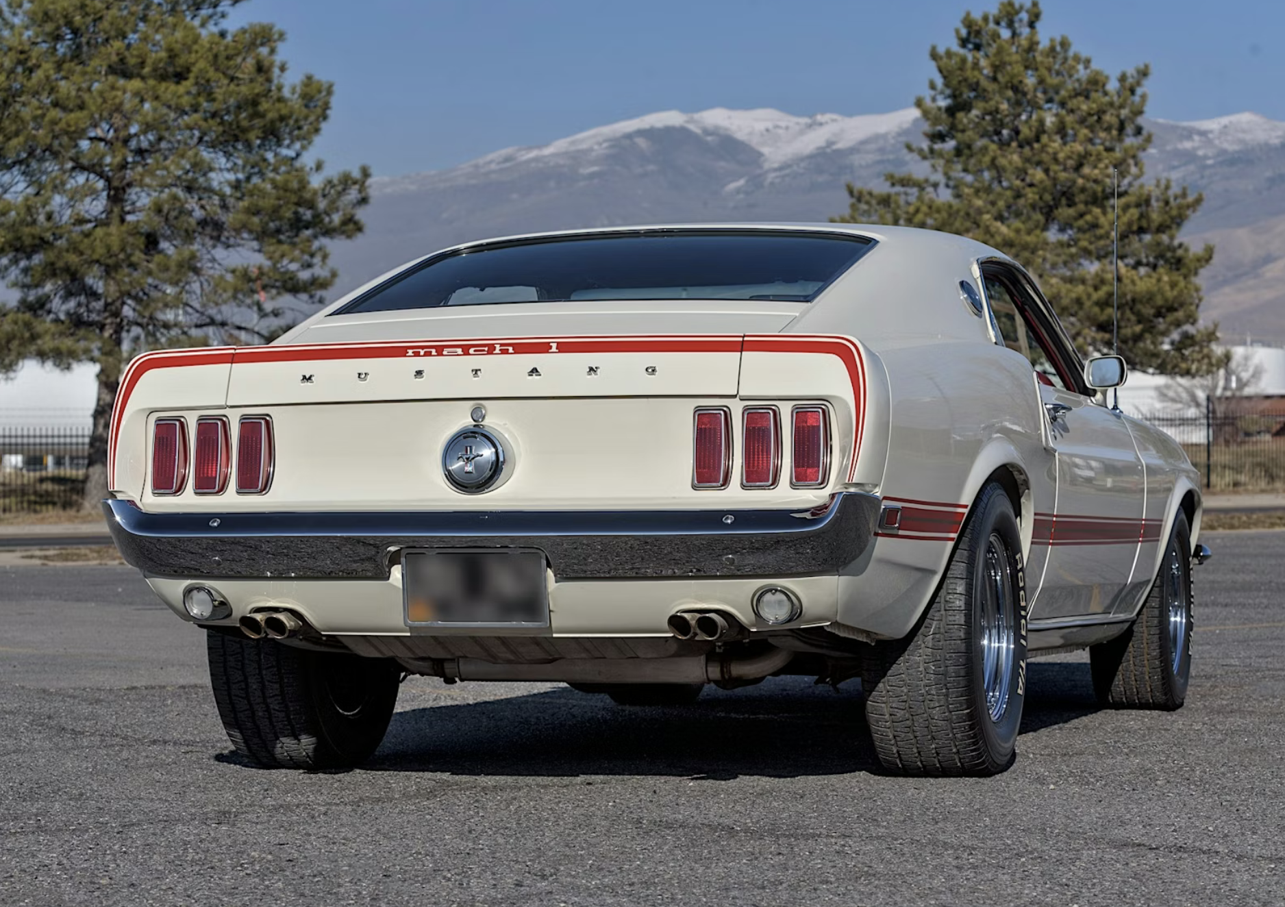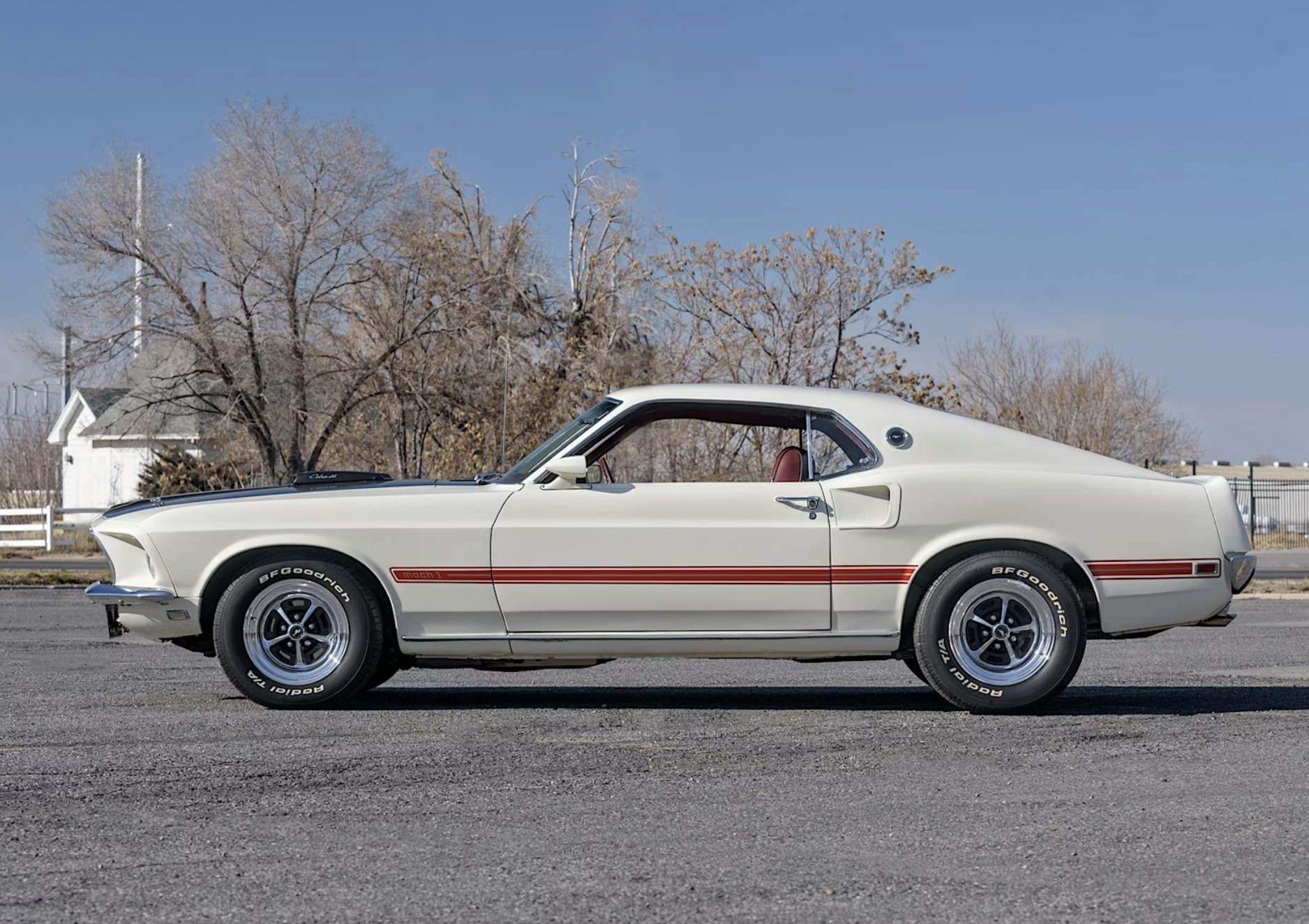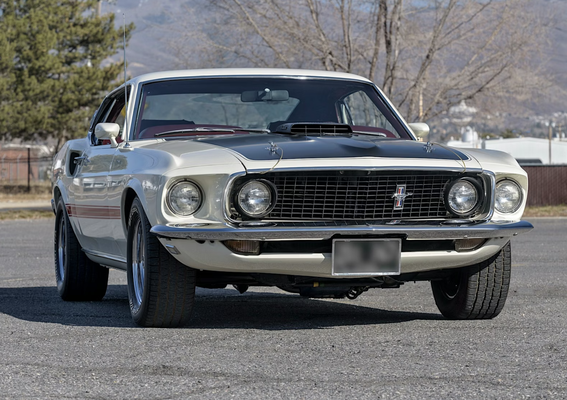 According to its data plate and VIN, the car was built May 12, 1969, at Ford’s Dearborn, Michigan, assembly plant and originally distributed through the Louisville district sales office. It is refinished in factory-correct Wimbledon White with red and gold side and rear stripes, a matte-black hood treatment and hood pins. The SportsRoof body features Mach 1–specific styling cues including a pop-open chrome gas cap, grille-mounted sport lamps and racing mirrors.