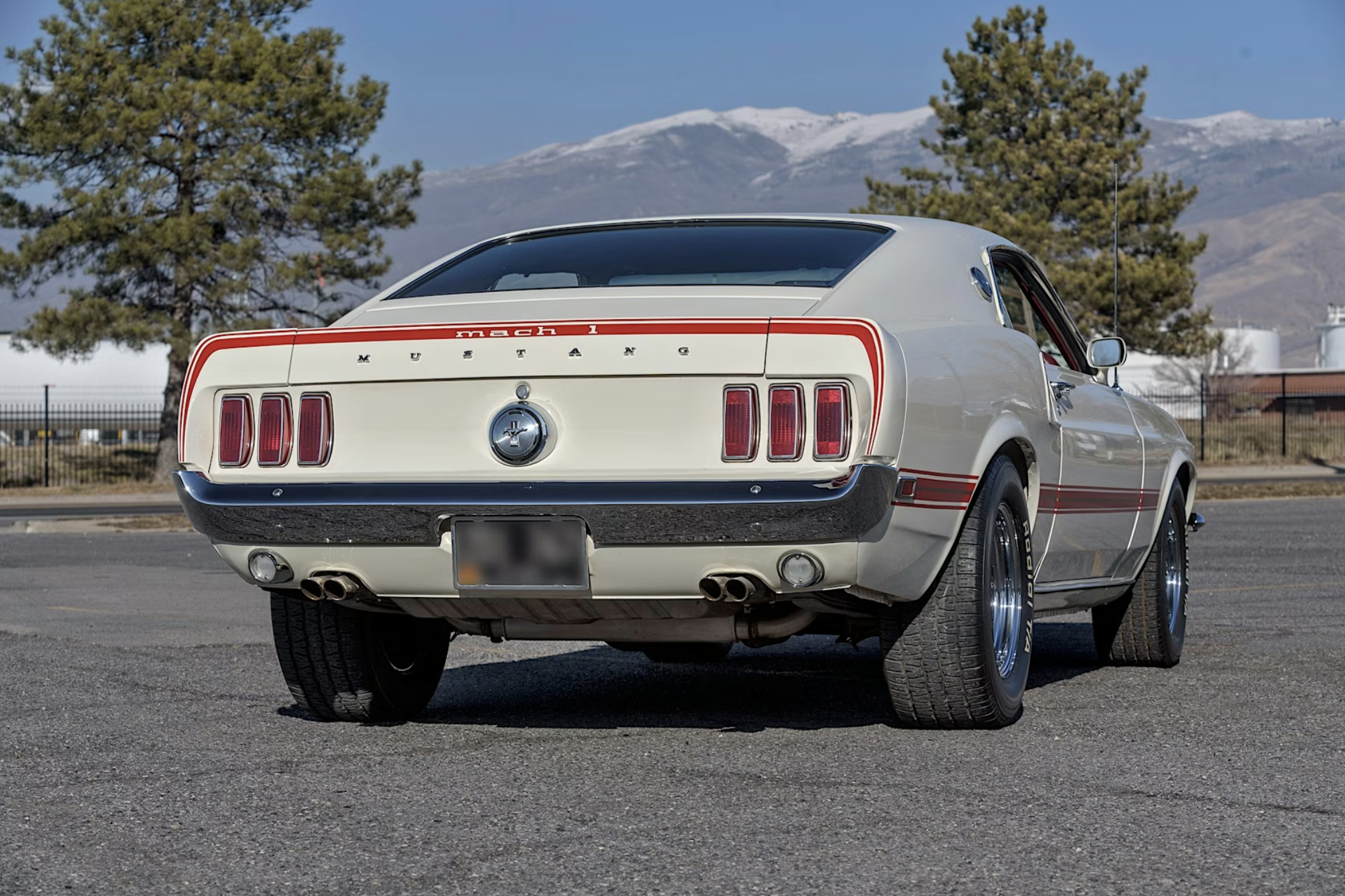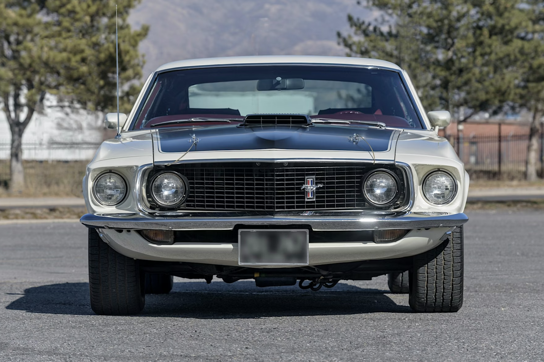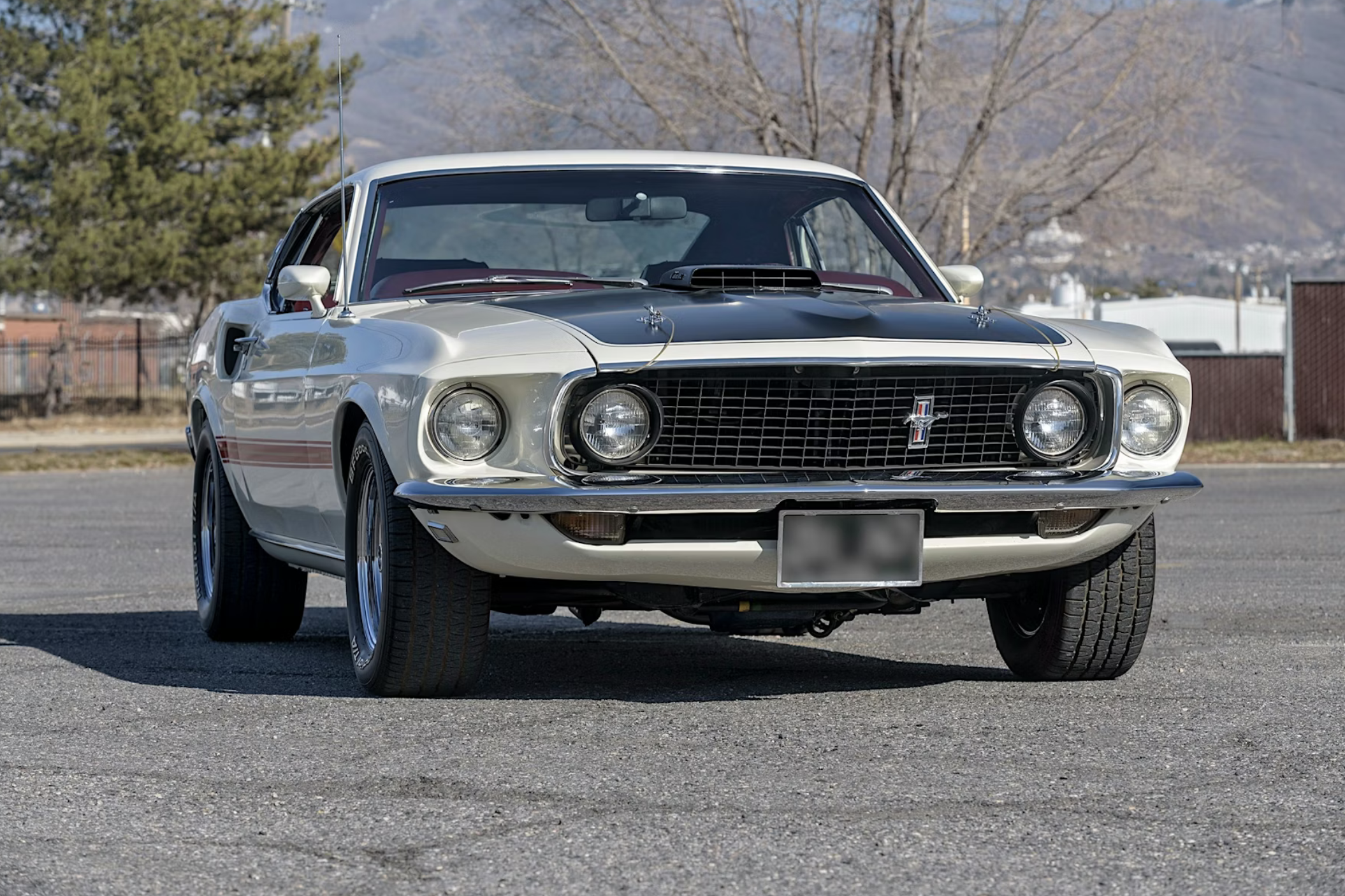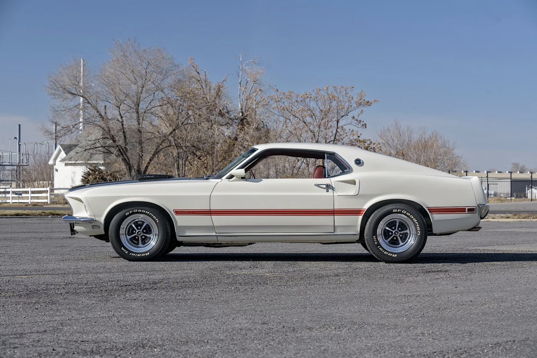 The car has been refinished in its factory-correct Wimbledon White with a matte-black hood treatment and red and gold side stripes. Exterior features include quad headlamps, hood pins, racing mirrors, a pop-open chrome gas cap and five-spoke chrome wheels wrapped in BFGoodrich Radial T/A tires. The Mach 1-exclusive SportsRoof body and competition suspension package add to its period performance appeal.