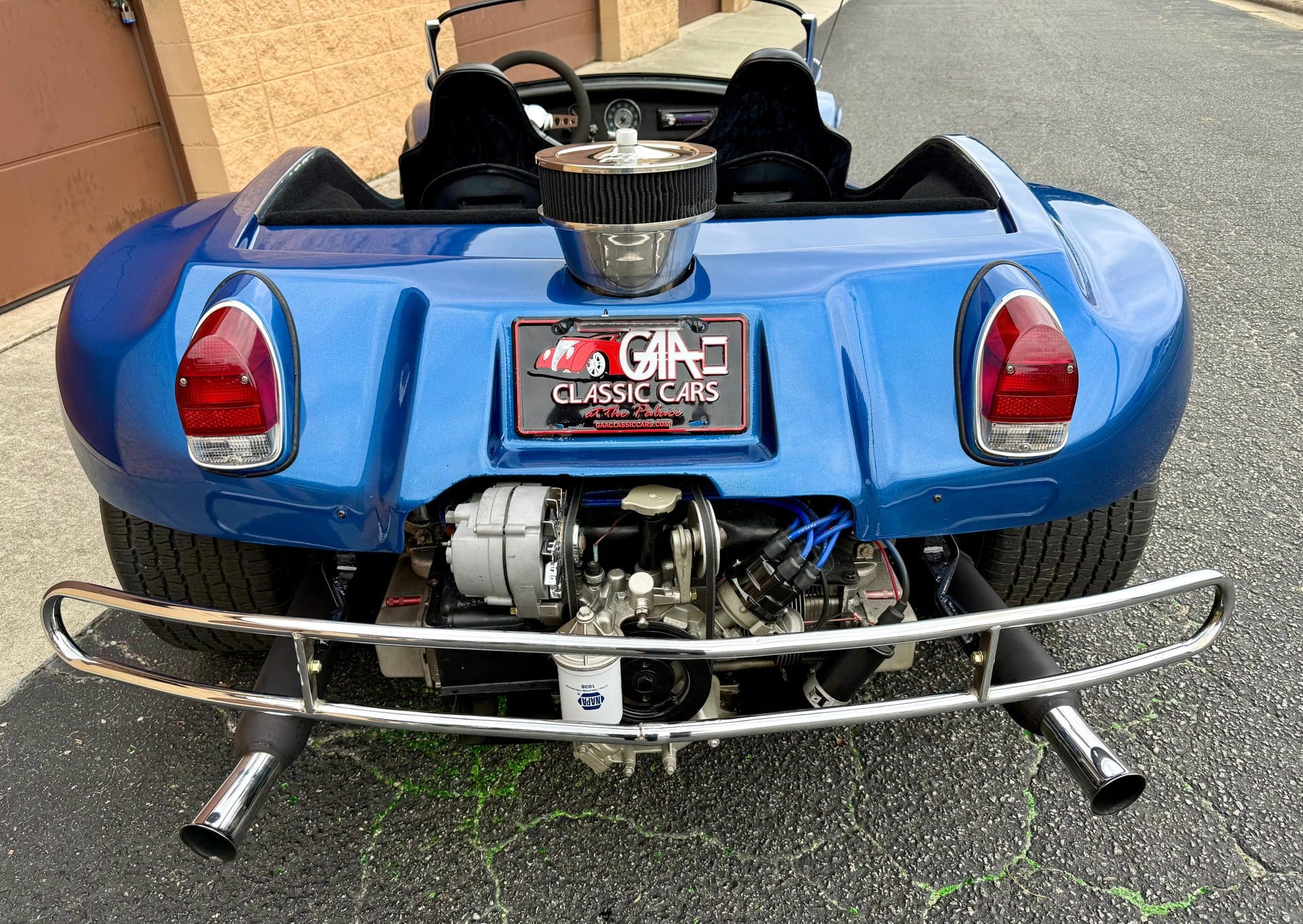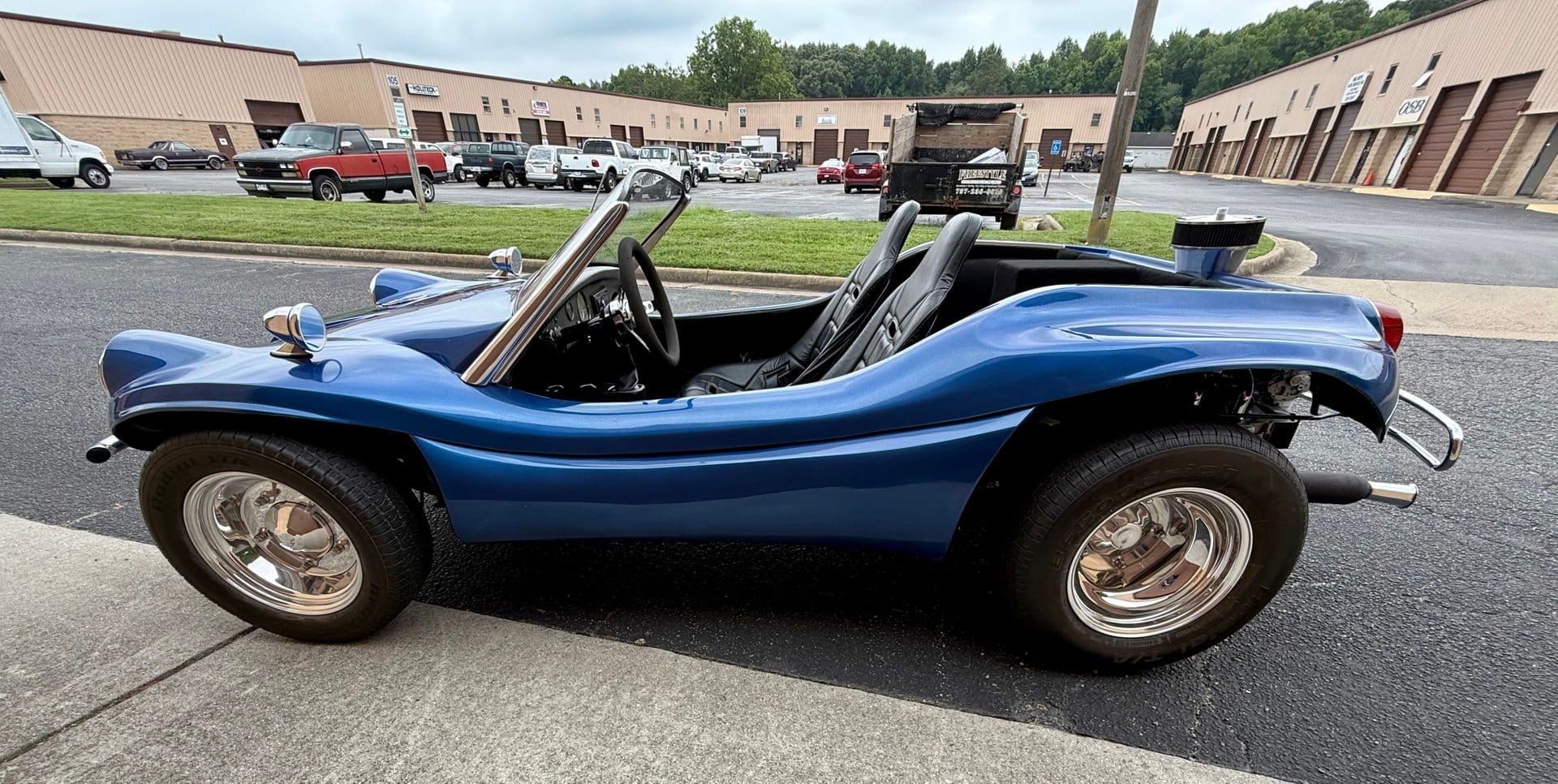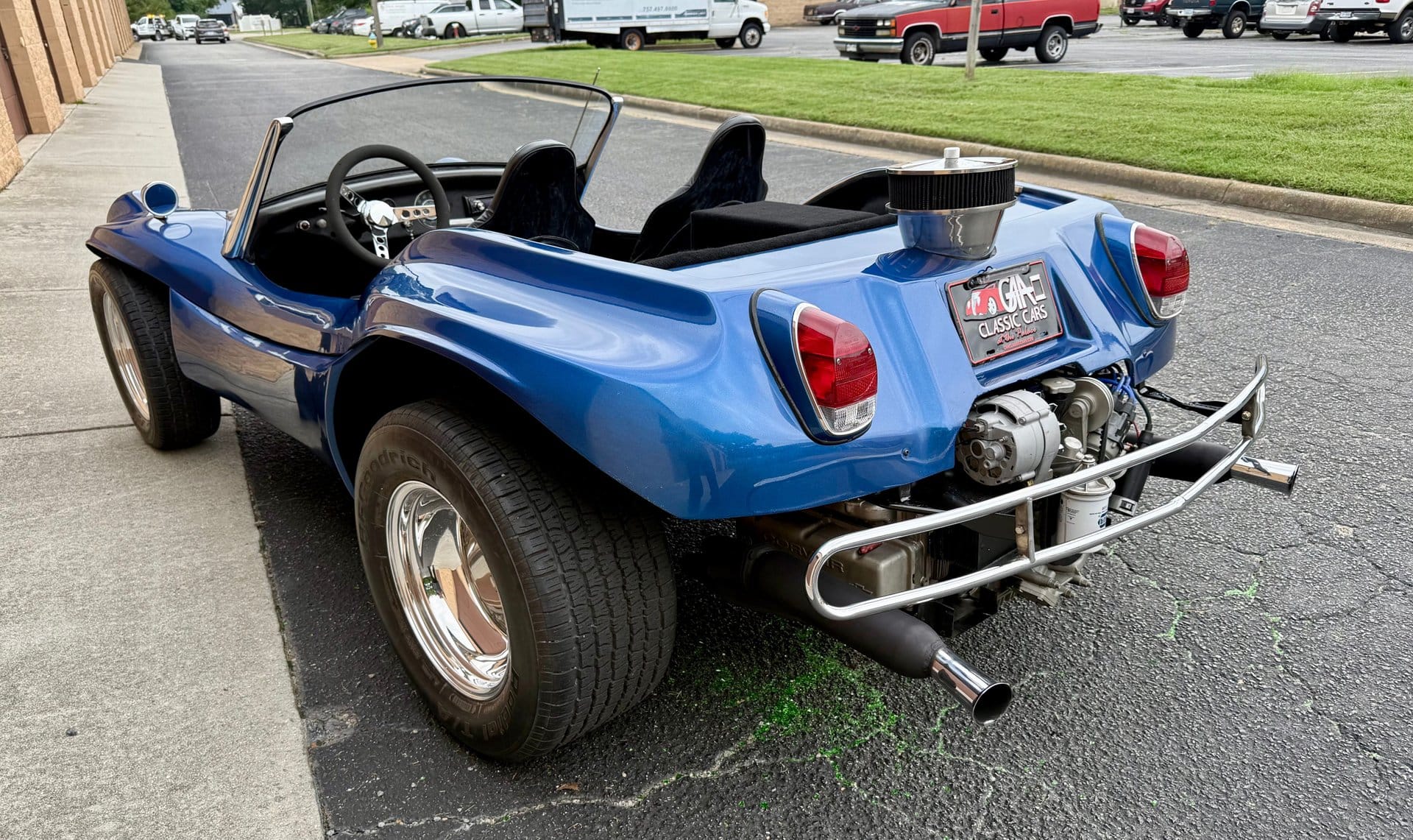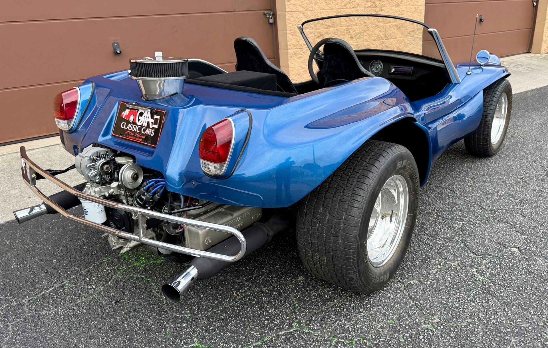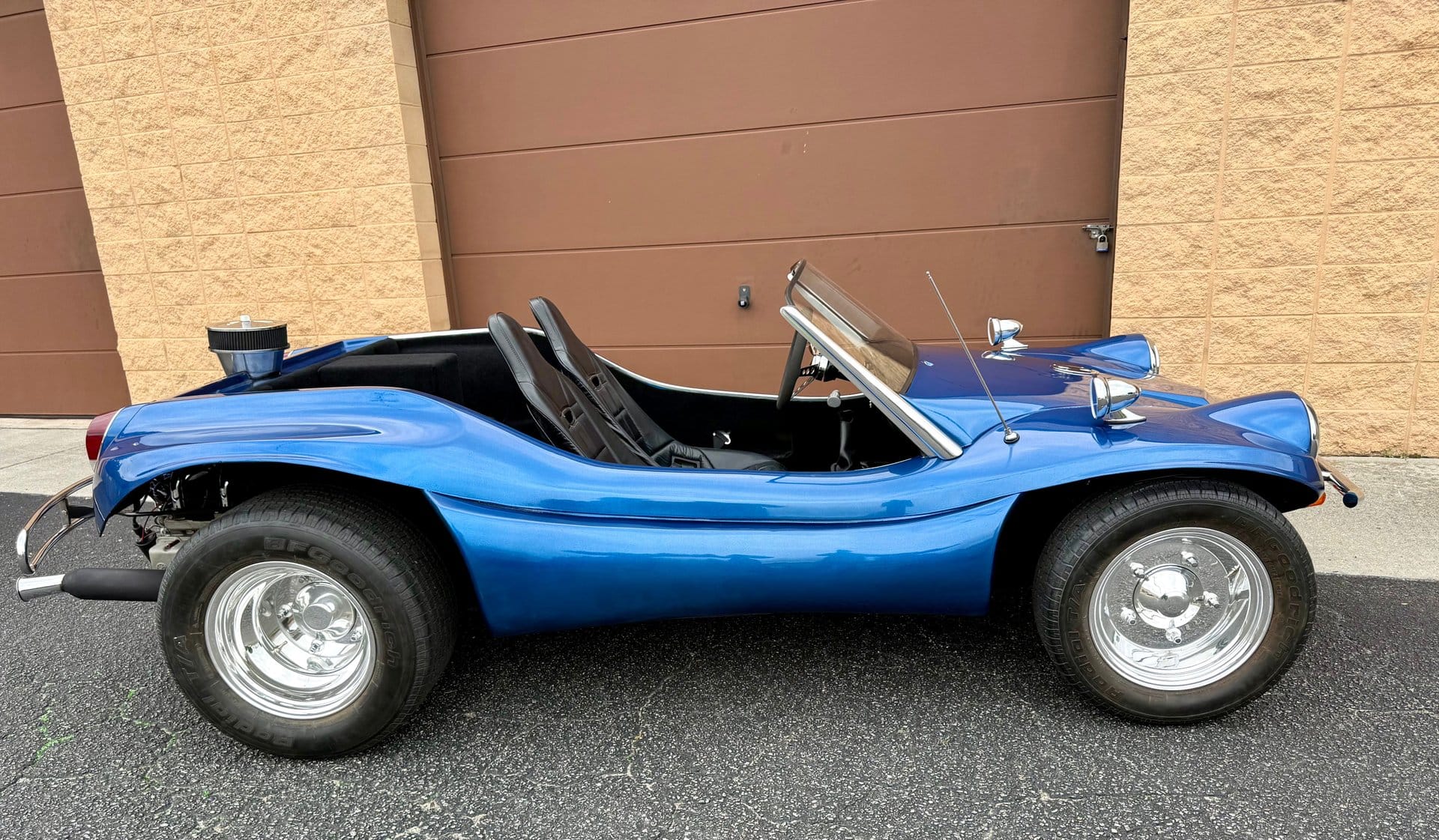 The 84-inch wheelbase buggy has been recently refinished in its original large metal flake blue, paying tribute to its period-correct look. Performance upgrades include a new Edelbrock four-barrel carburetor, K&N velocity stack, mild cam, aluminum-finned oil pan, and custom headers with a throaty exhaust note. Vintage Corvair SC Performance VW and Chevy aluminum valve covers add to its authenticity, while Taylor ignition wires and fresh 20W50 VR1 oil ensure it’s ready to run.