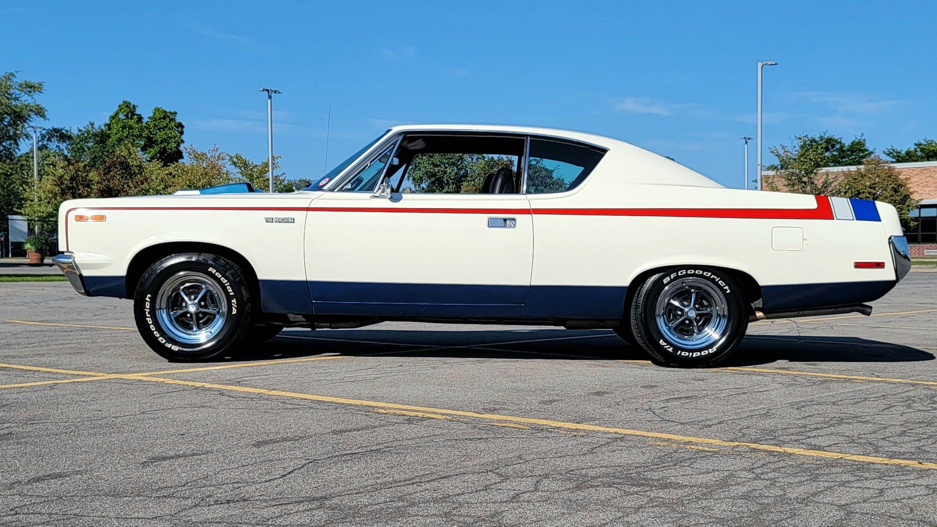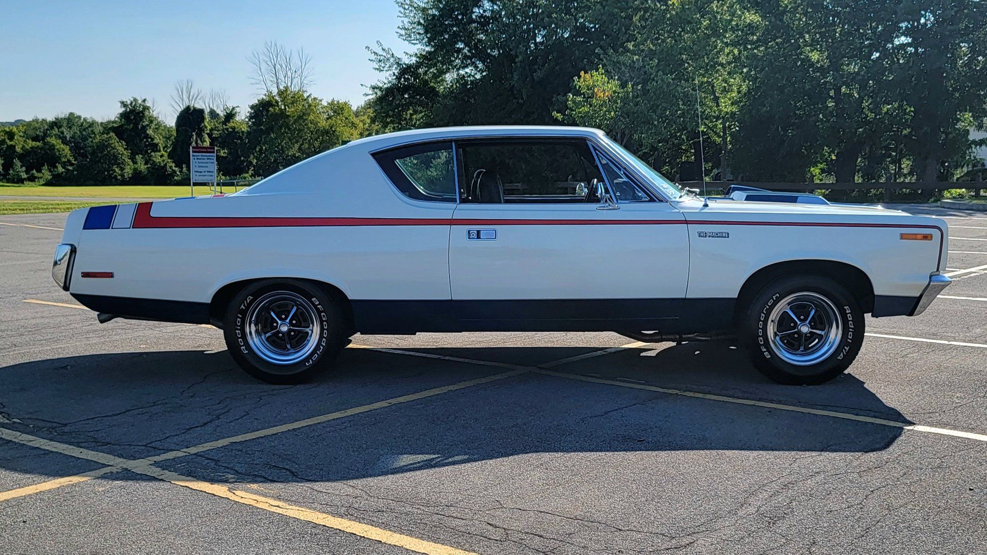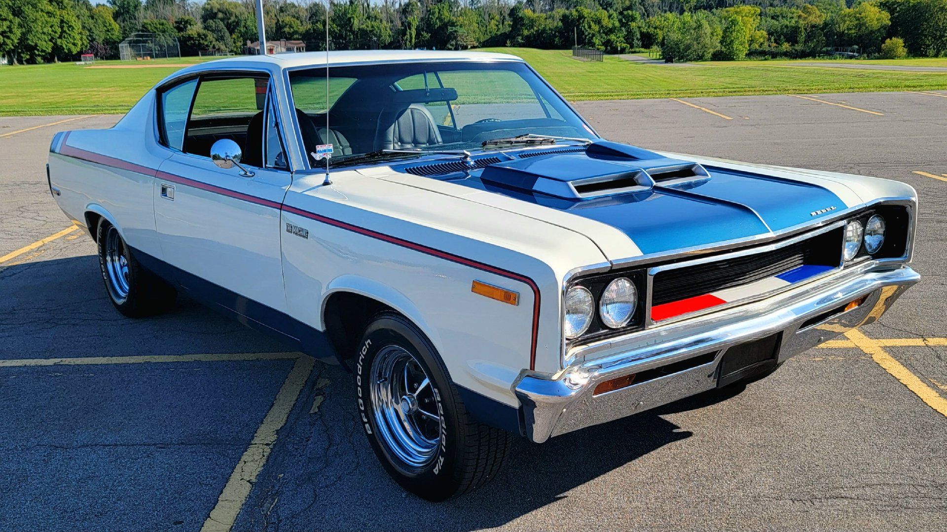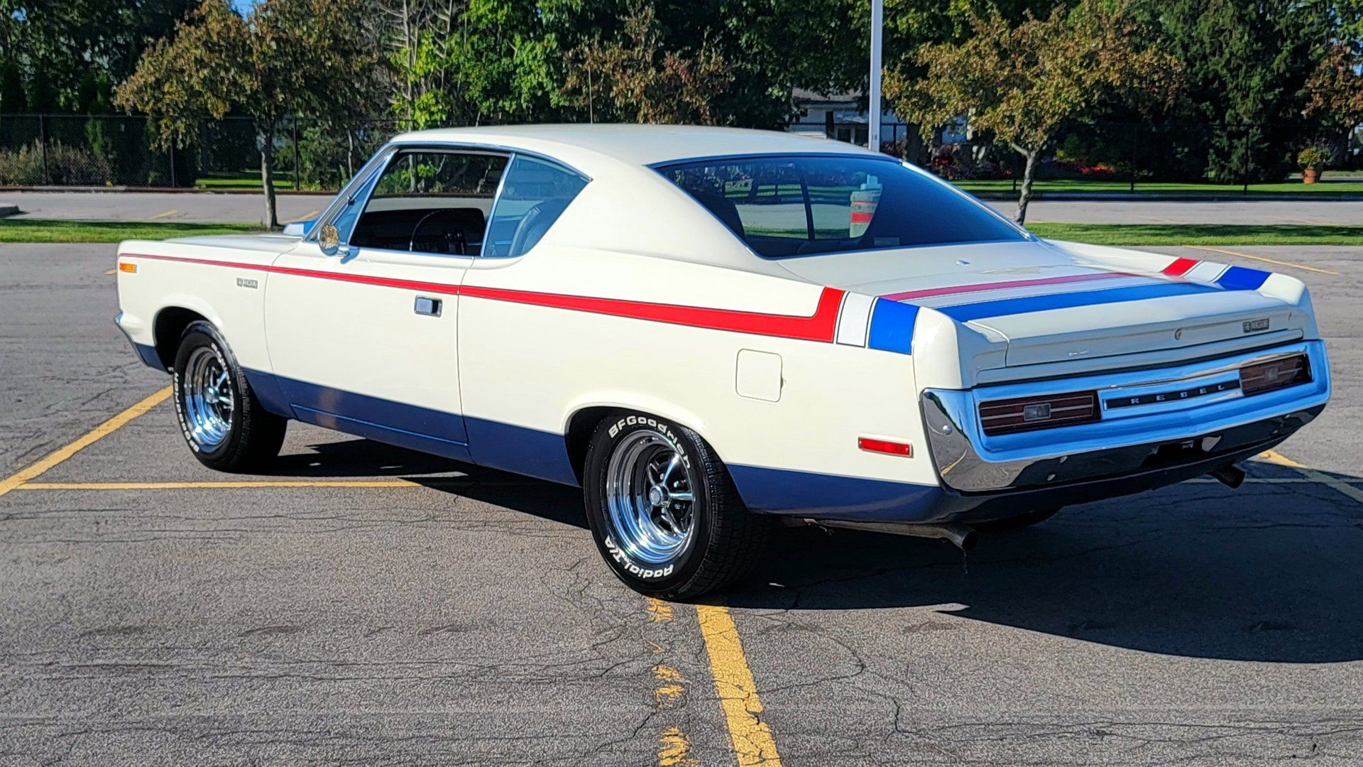 The Rebel Machine's design is instantly eye-catching due to its unique and patriotic color scheme. The body is painted white with red stripes that run from the fender back. A blue section on the hood accentuates the functional ram-air scoop and the hood-mounted tachometer, creating a design that not only turns heads but also symbolizes the American spirit.