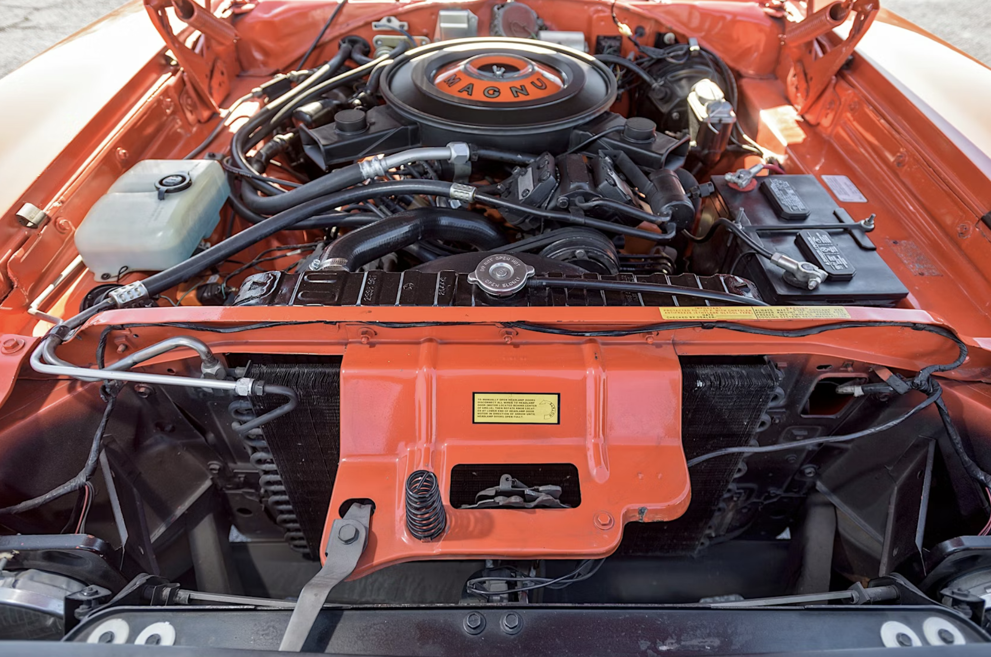 Power comes from a 440-cubic-inch Magnum V8 equipped with a four-barrel carburetor and factory rated at 375 horsepower. The engine is paired with a heavy-duty A727 TorqueFlite three-speed automatic transmission and a standard 3.23:1 rear axle. Factory equipment includes the R/T suspension package, power brakes, dual exhaust with chrome tips and a performance hood. Air conditioning was also specified from new, along with N95 evaporator emission controls for its original California delivery to Santa Ana Dodge.