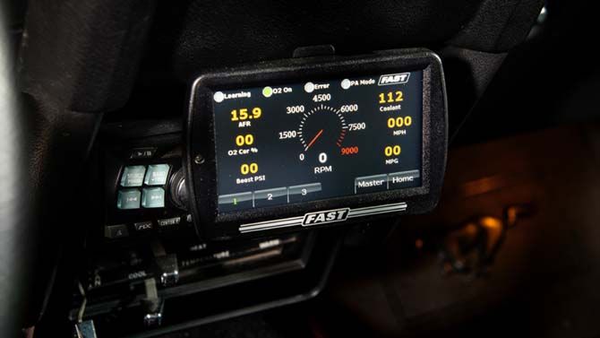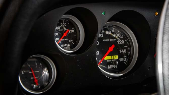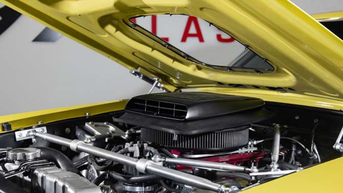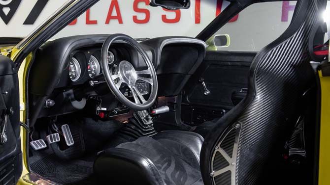 This build started with a clean Boss 302, but body was still stripped and professionally painted in the iconic yellow and matte black paint job seen here. With the exception of the big, wide wheels, it's impossible to spot this Boss 302 as a restomod, but that definitely changes on the inside where the carbon fiber racing seats, Autometer gauges and Hurst shifter are a clue of what type of modern performance this Mustang is packing.