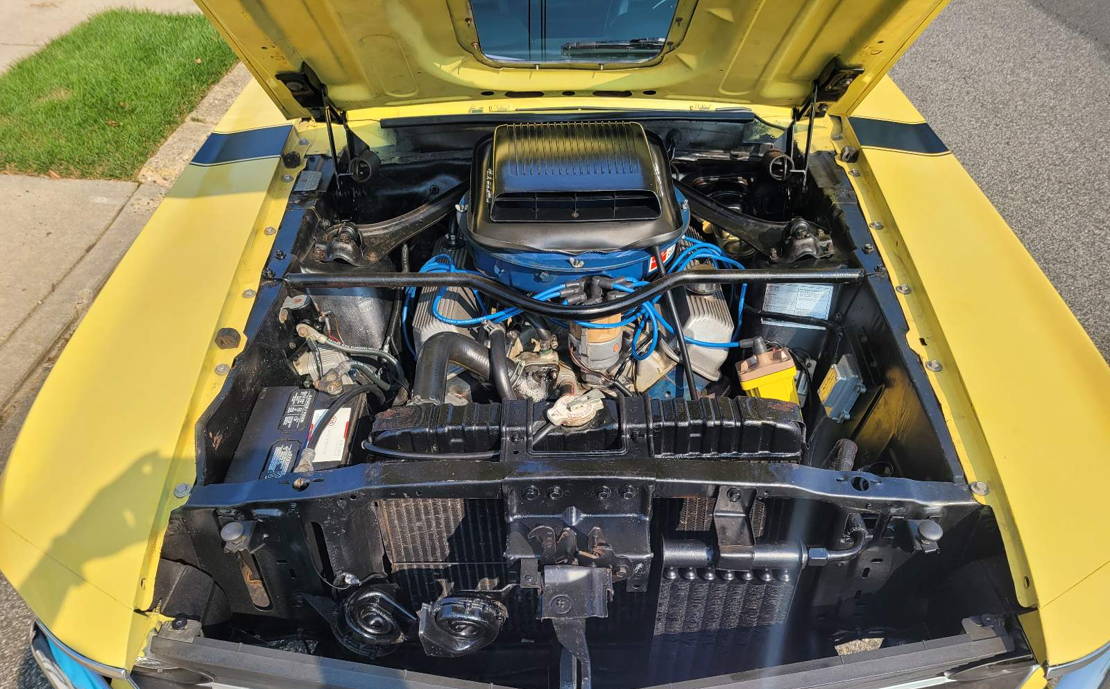 In 1977, the bright yellow paint was redone, and correct 302 stripping was applied. The interior is covered in black vinyl, with woodgrain accents around the gauge panel. Check out the video summary below and place your bid on this old school Boss here.
