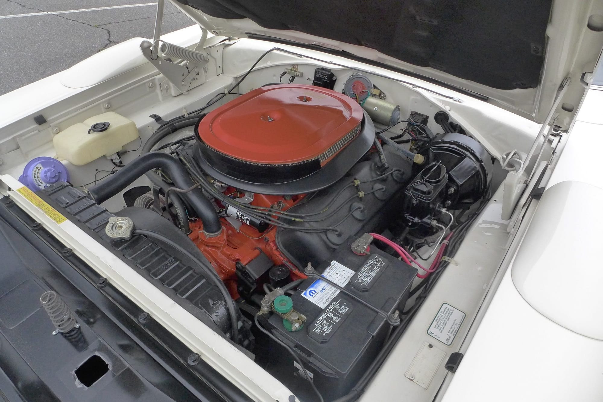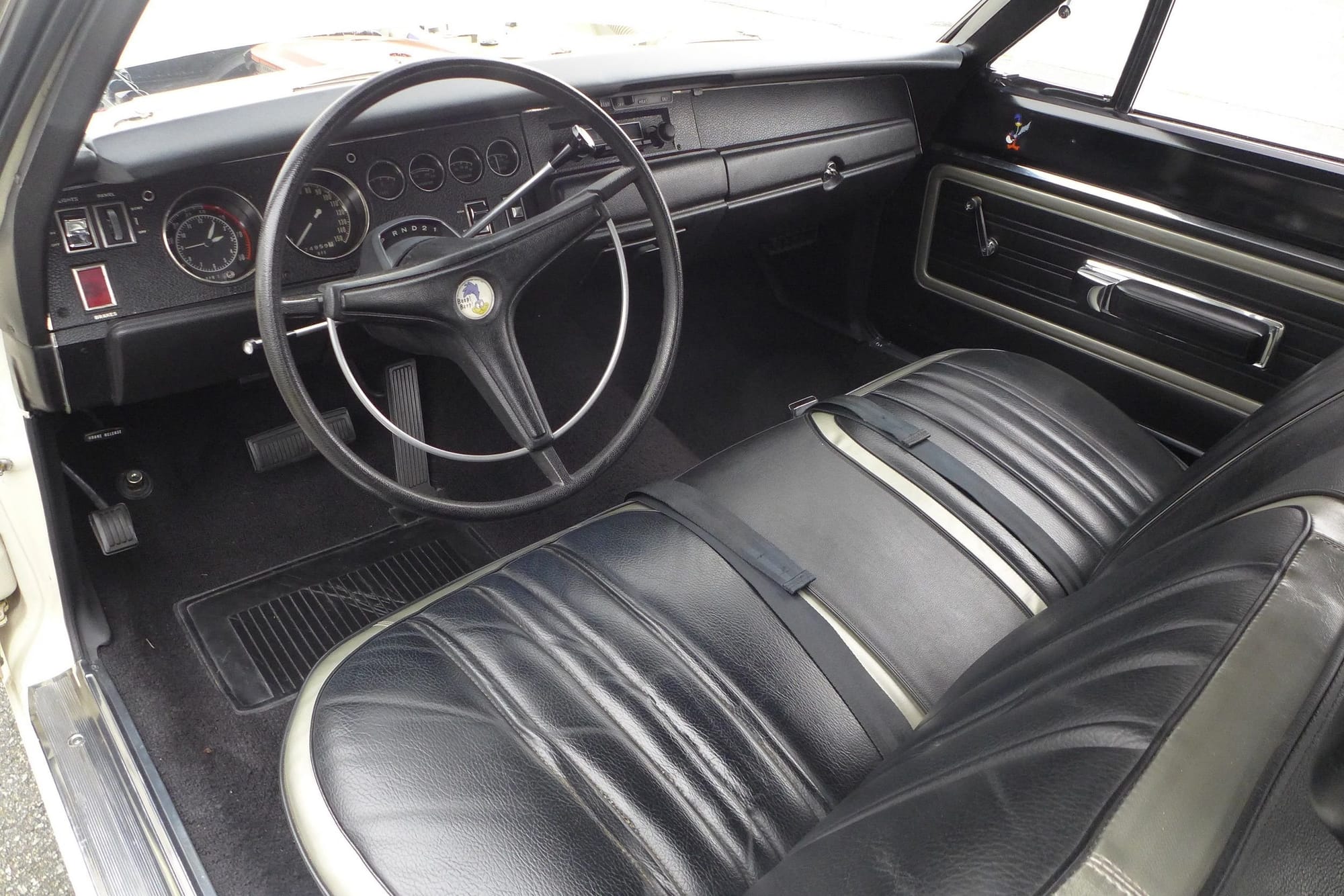 Repainted in its correct Alpine White finish in 2000, the car presents a clean, period-correct appearance. Inside, it features a black bench seat interior trimmed with silver piping and includes Rallye instrumentation, a Tic-Toc-Tach, and a Music Master radio. Power steering and front disc brakes complement its performance credentials, while Rallye wheels wrapped in Goodyear Polyglas GT tires complete the factory look.
