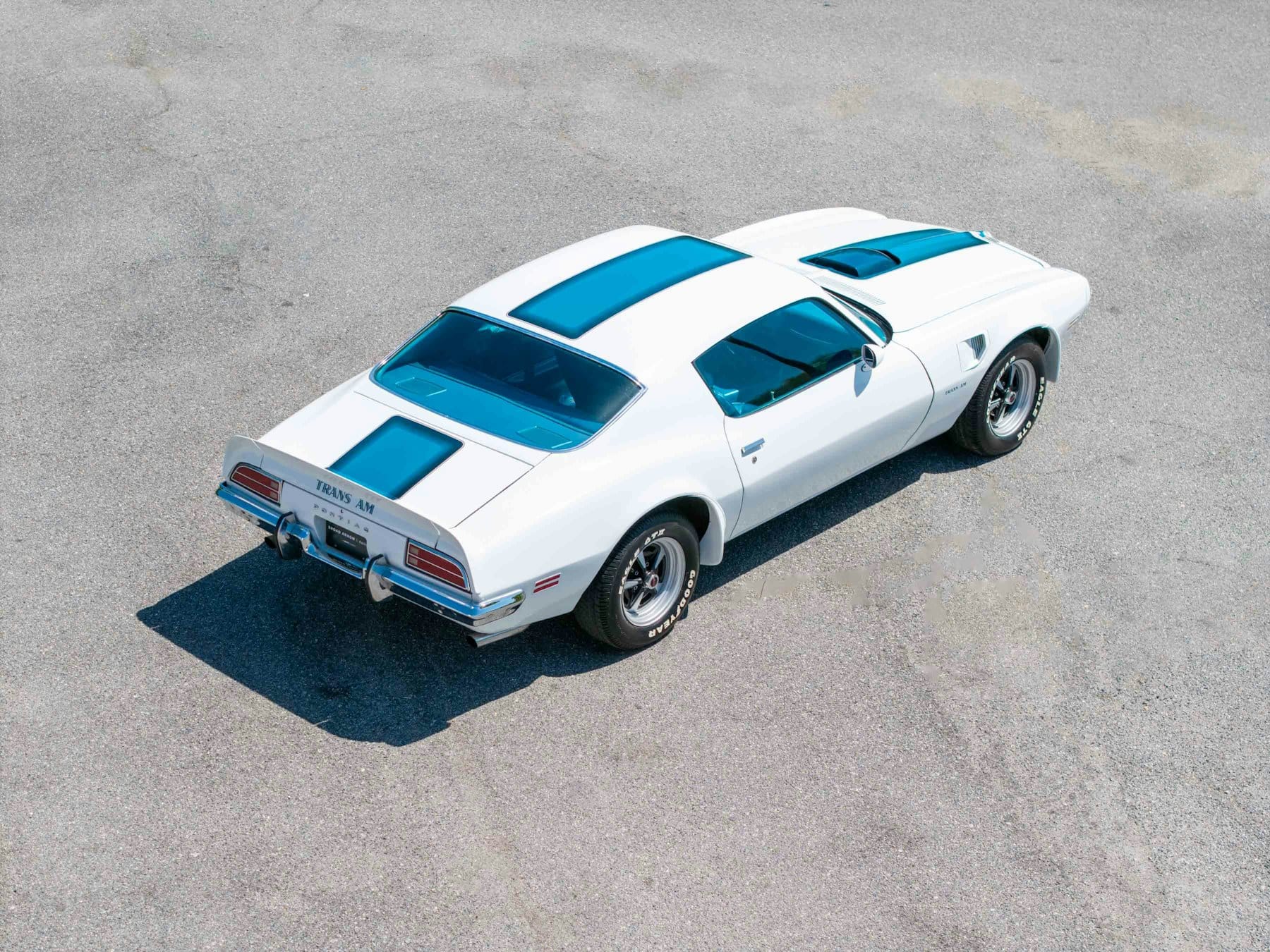 This Trans Am, finished in Polar White with its signature blue stripe, is powered by a correct 400-cubic-inch L74 Ram Air III V8 producing 345 horsepower and 430 lb-ft of torque. Power is sent to a 12-bolt rear axle with a 3.73:1 gear ratio through a Muncie M21 close-ratio four-speed manual transmission, equipped with a factory Hurst shifter.