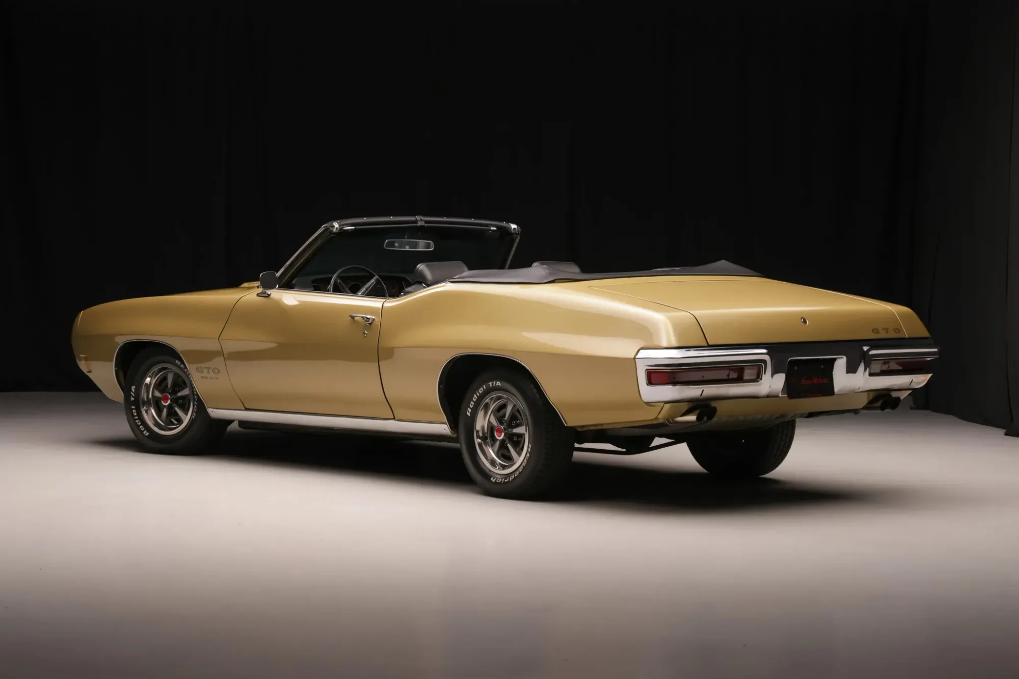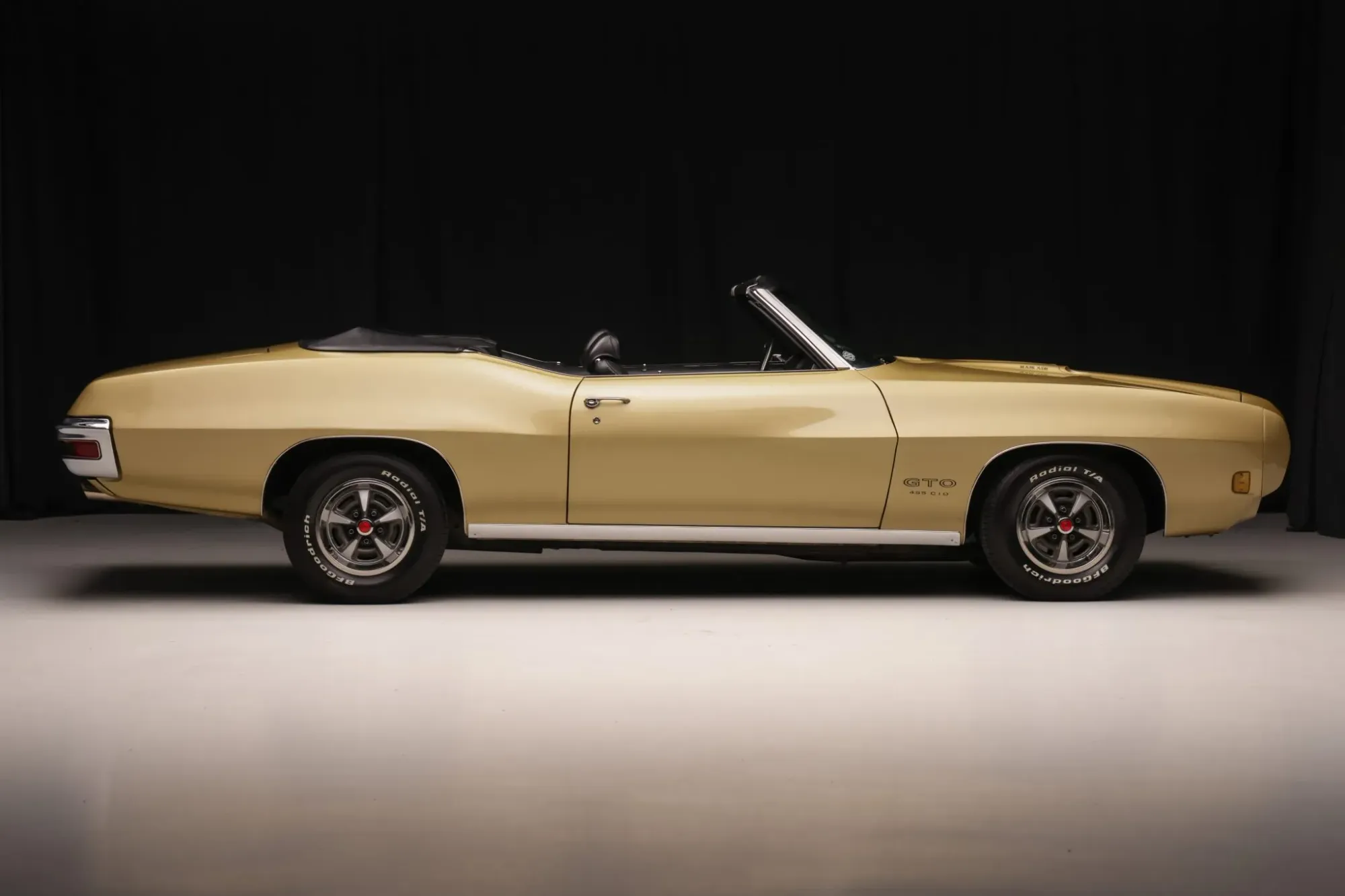 The GTO sits on 14-inch Rally II wheels wrapped in BFGoodrich Radial T/A white-letter tires, with a full-size spare conveniently stowed in the trunk. The car is equipped with power steering, and braking is handled by power-assisted front discs and rear drums, providing a balance of performance and drivability.