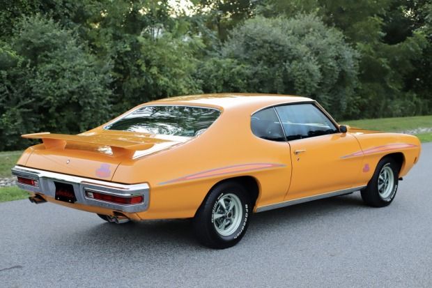 The interior consists of black leather and wood paneling on the gauge cluster, making it the perfect match for any classic car enthusiast. This design perfectly contrasts the Orbit Orange exterior and gives a lot more weight to the pink decals. In particular, the steering wheel provides the car with a bit of extra muscle car design as it combines the no-nonsense attitude of the American V8 with the flashy style characteristics of the Pontiac GTO Judge. Strutting its stuff is this car's thing, and with a big V8, plenty of power, and classic '70 style, the only question is, who's going to be behind the wheel?