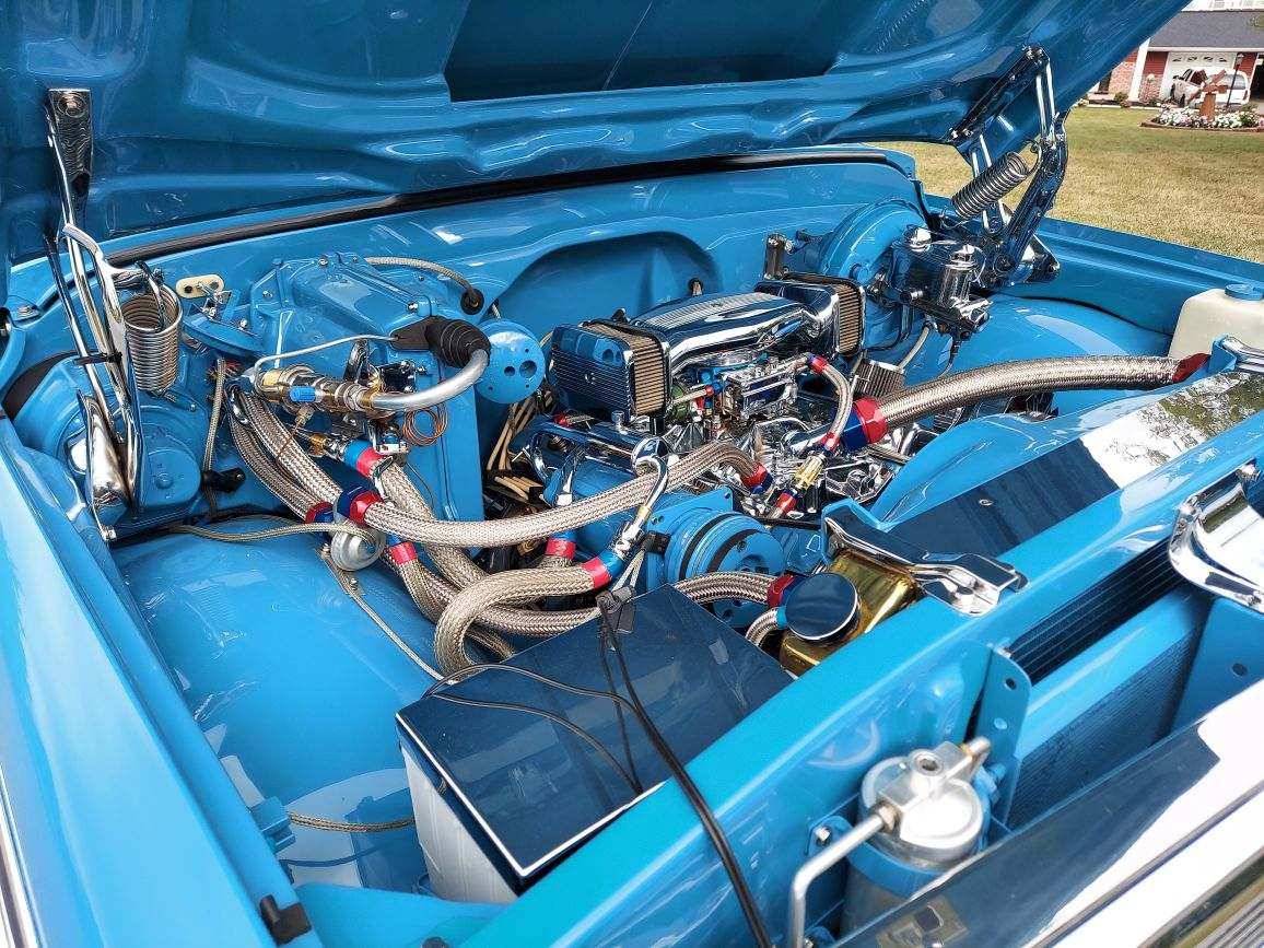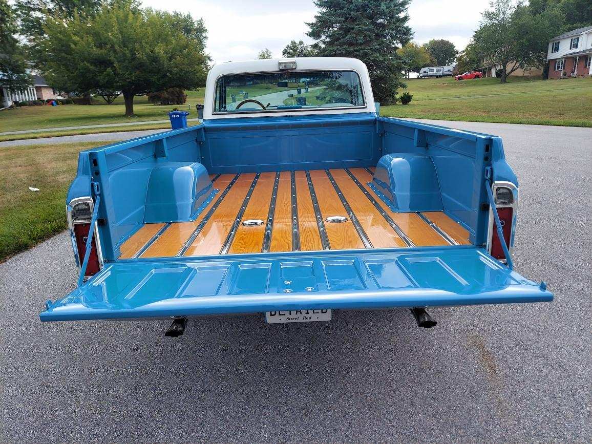 A striking feature of this Cheyenne is its paint job. Adorned in its original shades of Hawaiian Blue and White, the truck shines with a PPG base coat and clear coat. The finish has been wet sanded 360 degrees, ensuring a smooth and flawless appearance from every angle.