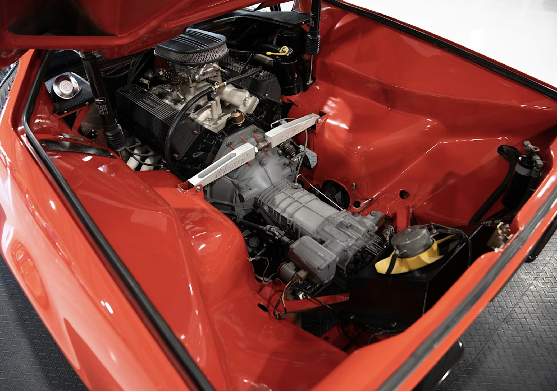 This particular example is powered by a mid-mounted 351 cubic inch Ford Cleveland V8 engine paired with a five-speed manual transmission. The setup delivers power to the rear wheels and is supported by a chassis design featuring four-wheel disc brakes, rack-and-pinion steering, and a front-mounted radiator with dual electric fans. The car’s performance credentials are further underscored by its factory instrumentation, including a 180-mph speedometer and an 8,000-rpm tachometer.
