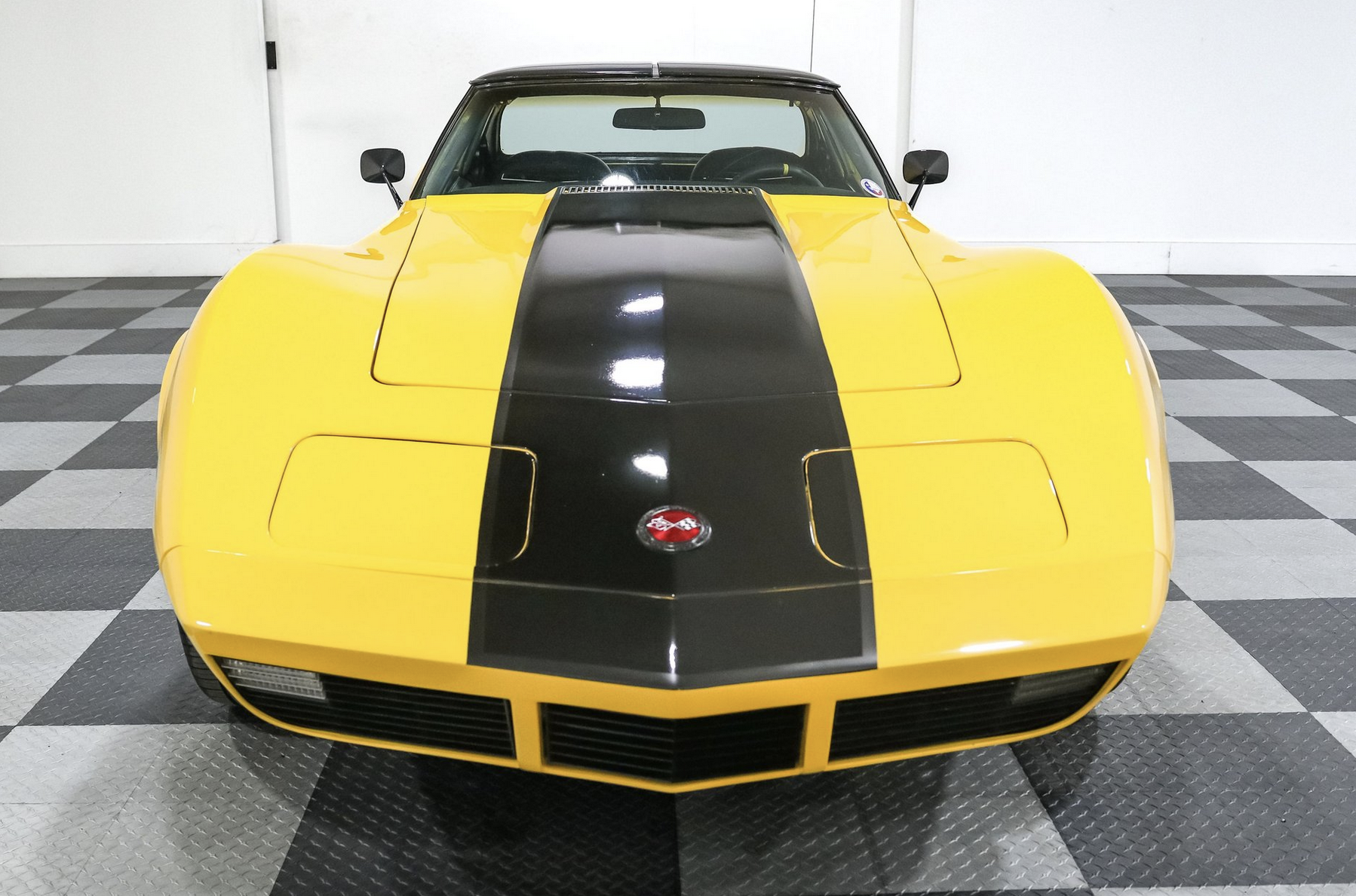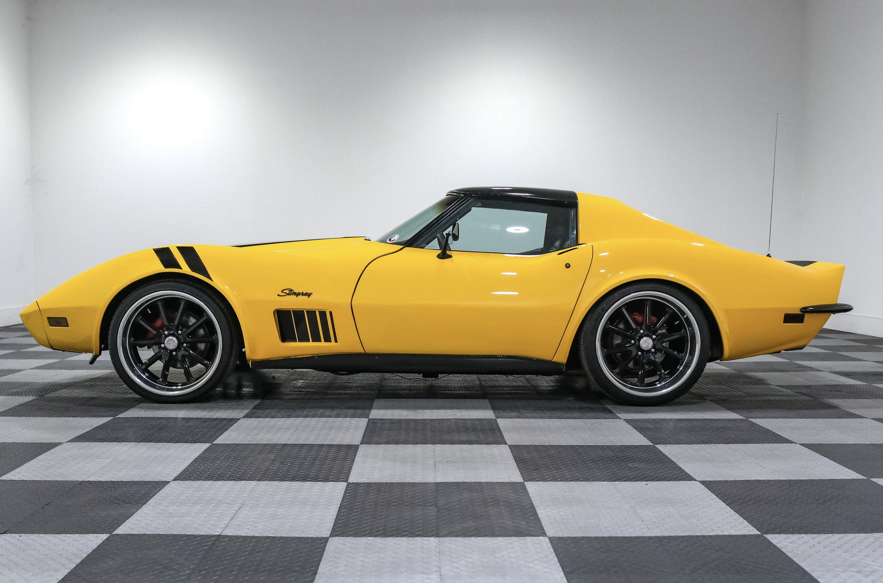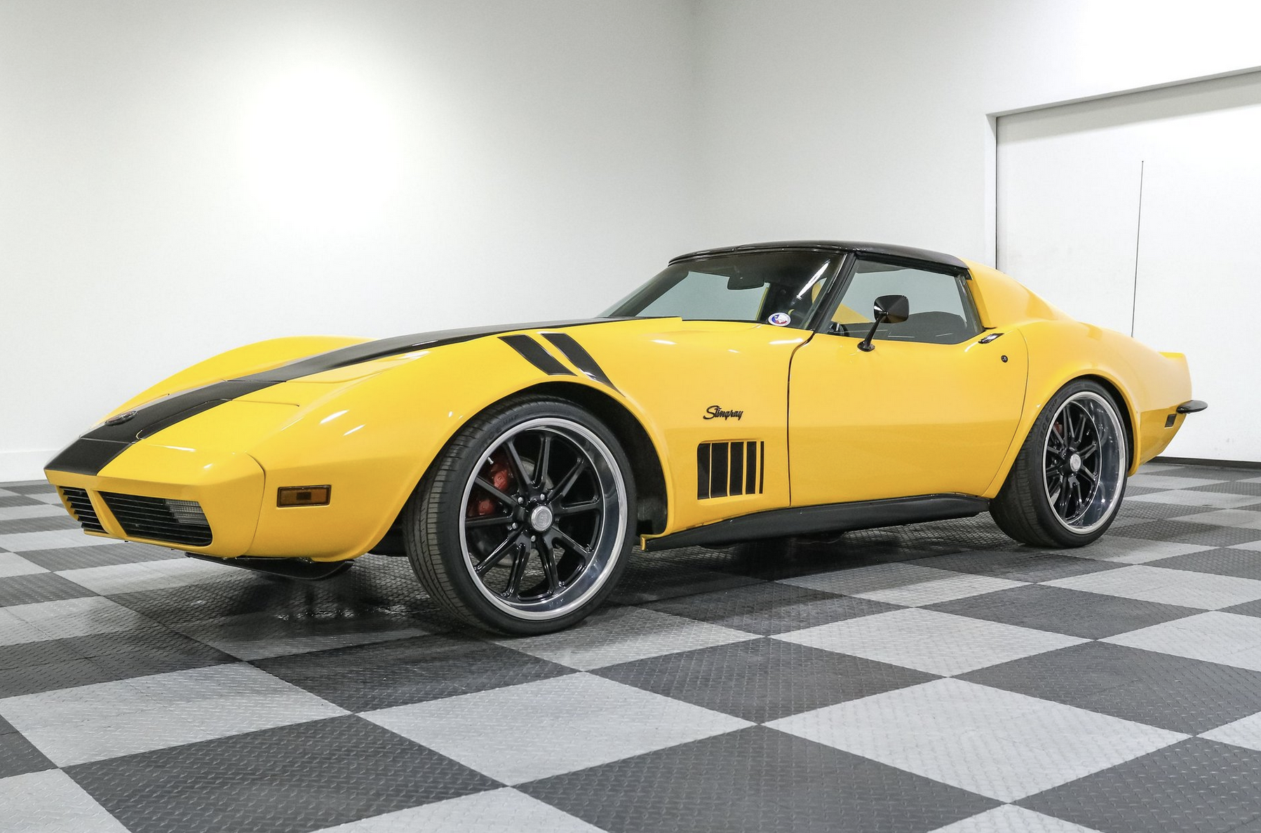 The exterior is finished in custom yellow and black paint that emphasizes the C3’s signature curves. T-Tops provide open-air flexibility, while 20-inch US Mags wheels create an assertive stance aligned with pro-touring builds. A steel rear bumper conversion sharpens the rear profile and references the chrome bumper heritage admired by Corvette fans.