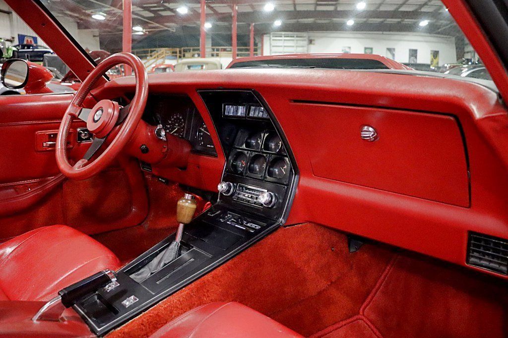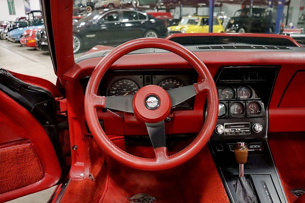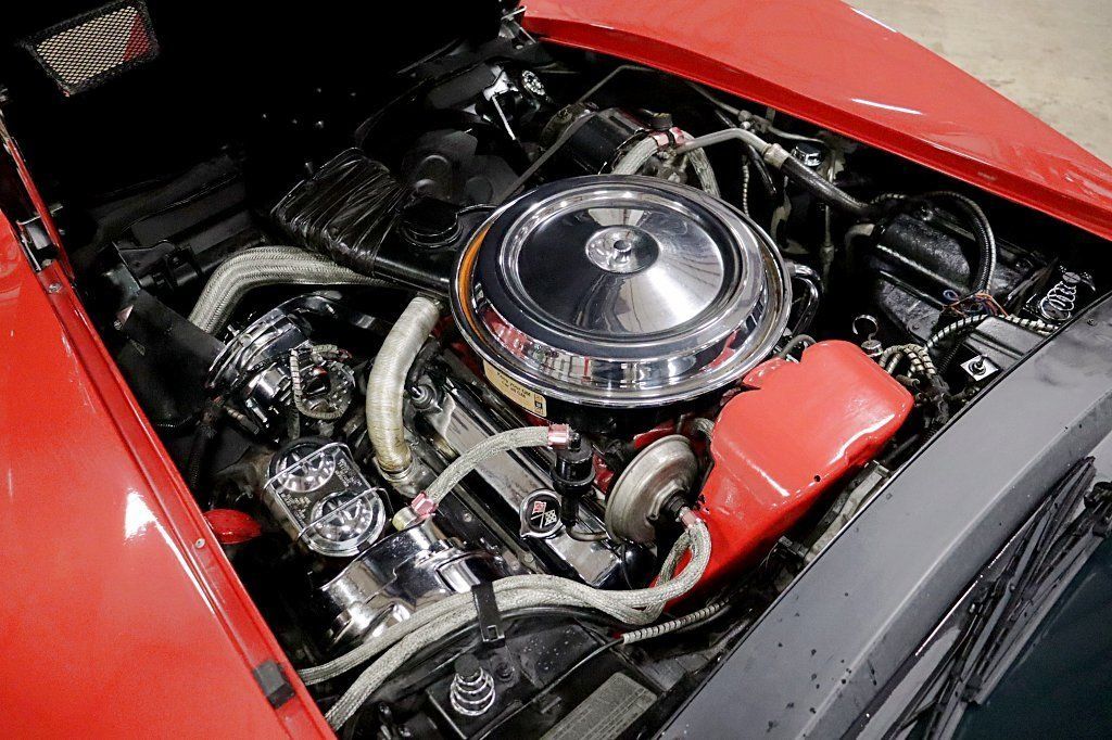 Open the doors to an exceptionally clean interior finished in red vinyl with black and chrome accents throughout. In addition, this car is equipped with air conditioning to keep the cabin nice and cool, and the convenience of power windows which roll down at the touch of a button. According to the seller, this classic Corvette has just under 40,000 miles on the clock.
