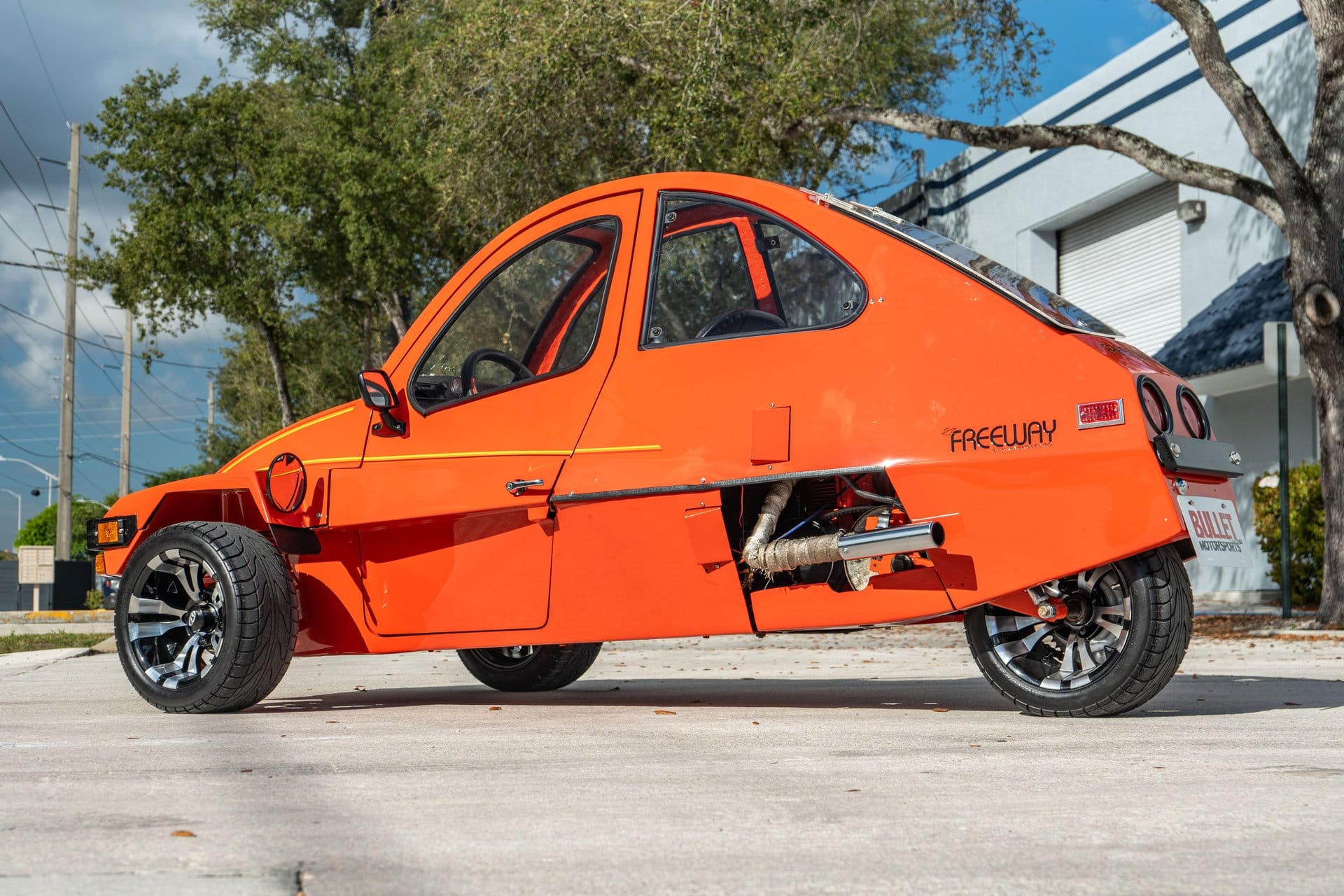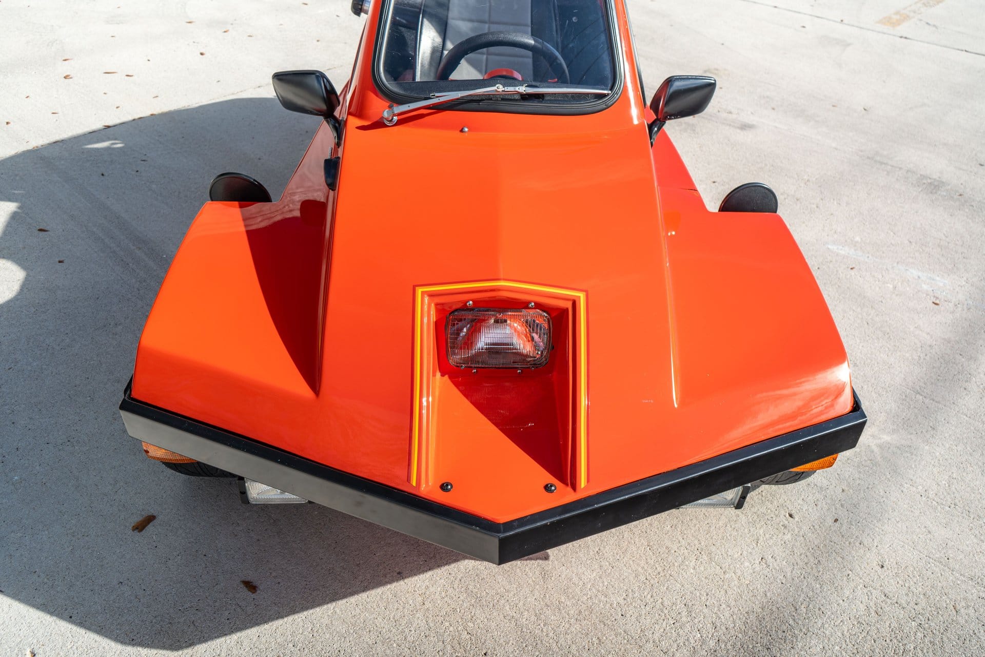 Refurbishment work under previous ownership included repainting the body in orange, a color not originally offered, along with the application of multicolor stripes and FreeWay decals. The acrylic windshield, side windows, rear quarter pop-out windows, and rear hatch were also replaced. Exterior features include a removable roof panel, a single left-side door, a central sealed-beam headlight, driving lamps, a windshield wiper, black steel bumpers, and a side-exit exhaust. The vehicle rides on black-finished 12-inch ITP alloy wheels with polished spokes, fitted with 215/40 Backlash tires.